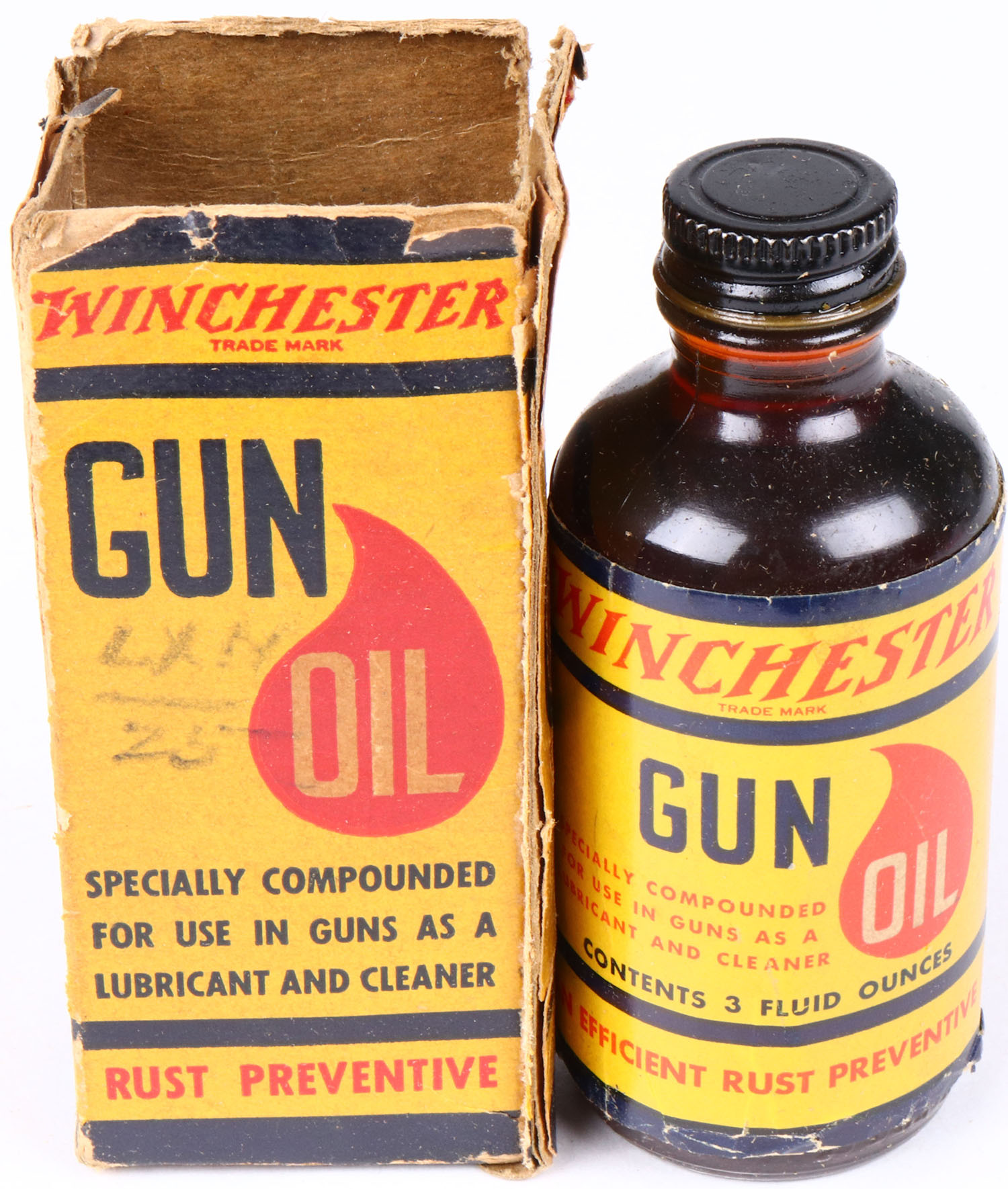 Winchester Gun Oil, with cardboard box glass jar with screw on cap, FULL, glass jar is solid with age soiling and scuffing to label. Grade: Very Good - Value: 10 to 40
