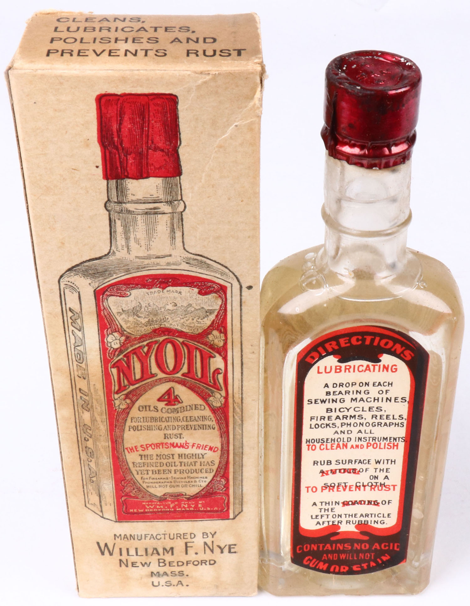 RARE! Large Nyoil glass oil jar, with orignal box, Full and Sealed, 7'' tall, box has light age soiling but is still very nice, bottle is near MINT. Grade: Excellent ++ - Value: 50 to 350