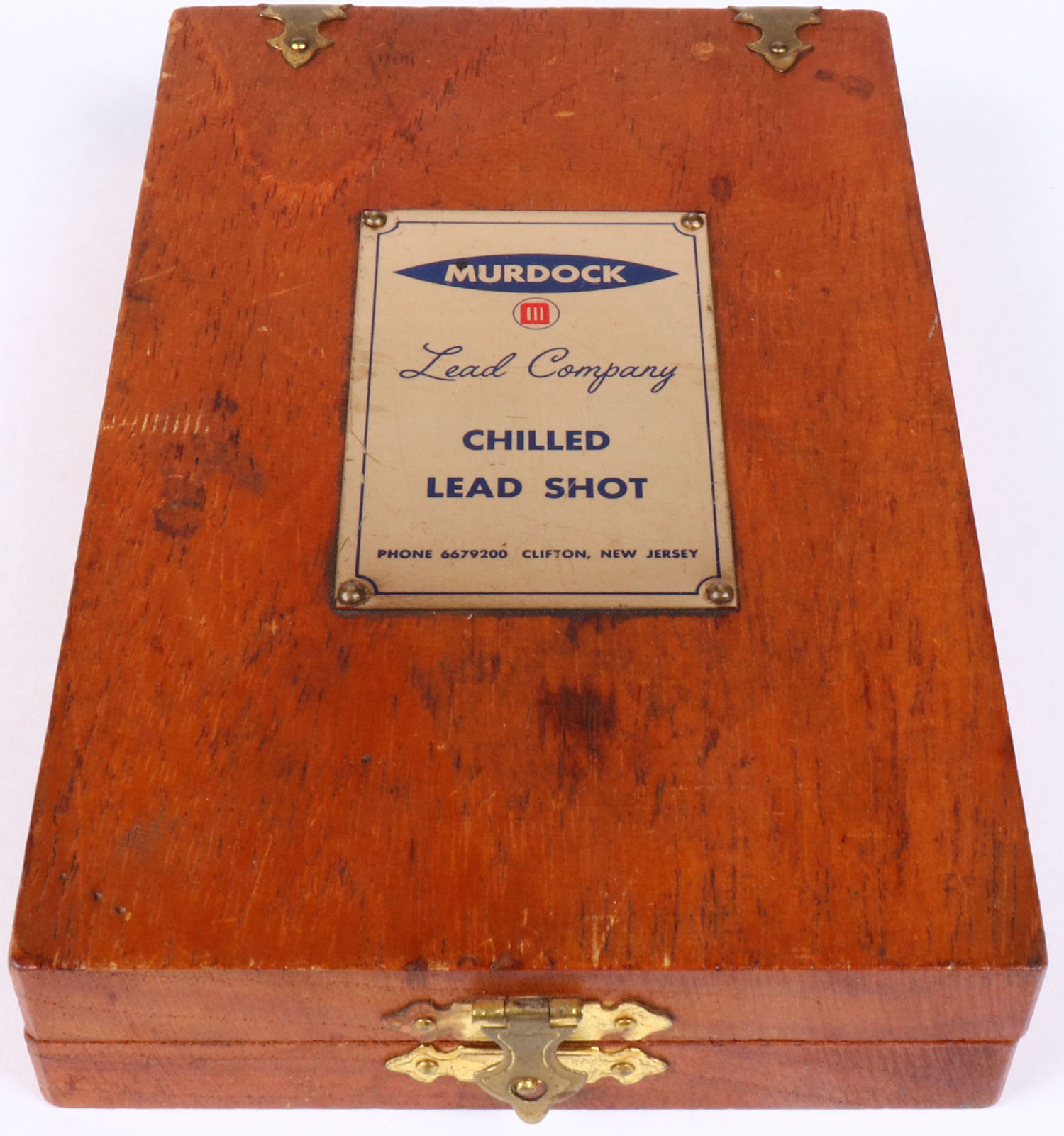 Murdock Lead Company Chilled Lead Shot in wood case, various sizes of shot, all bright and clean. Grade: Excellent ++ - Value: 20 to 200