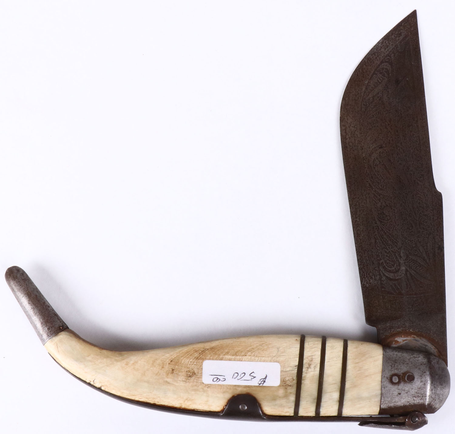 EARLY Folding knife marked ''Recuerdo De Madrid'', 7'' blade, stag handle has a crack to one side, blade has as locking mechanism, has age soiling but still functions well. Grade: Very Good - Value: 200 to 600