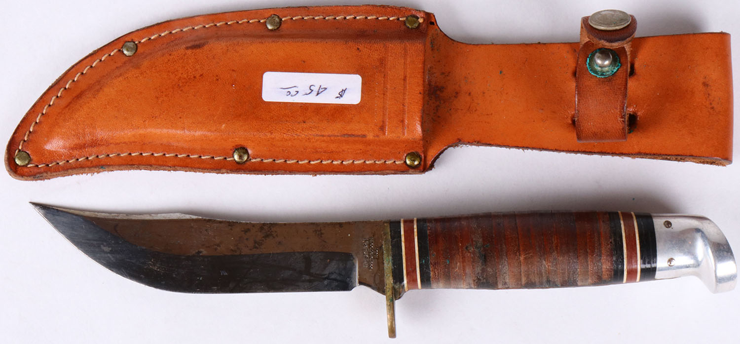 Western fixed blade knife half hilt, leather washer handle, aluminum pommel, leather sheath, 4 1/2'' blade, some age soiling. Grade: Very Good ++ - Value: 10 to 100