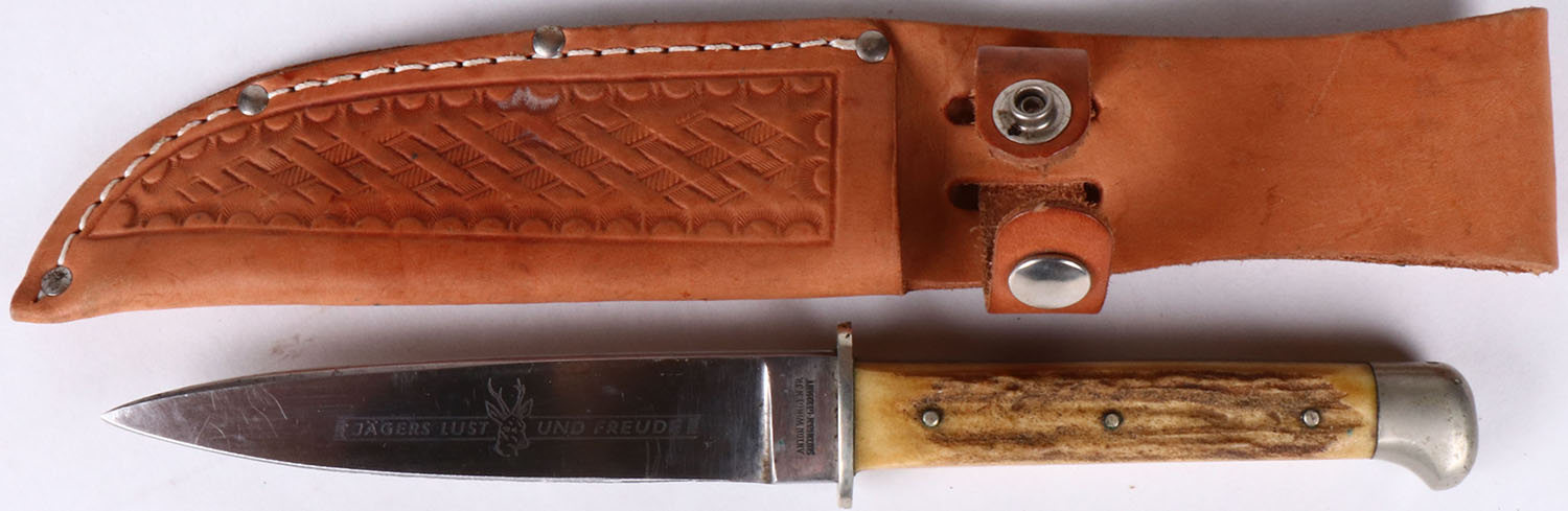 Jagers Lust Und Frede fixed blade knife, stag handle, leather sheath, 5'' blade, age soiling. Grade: Very Good - Value: 10 to 60