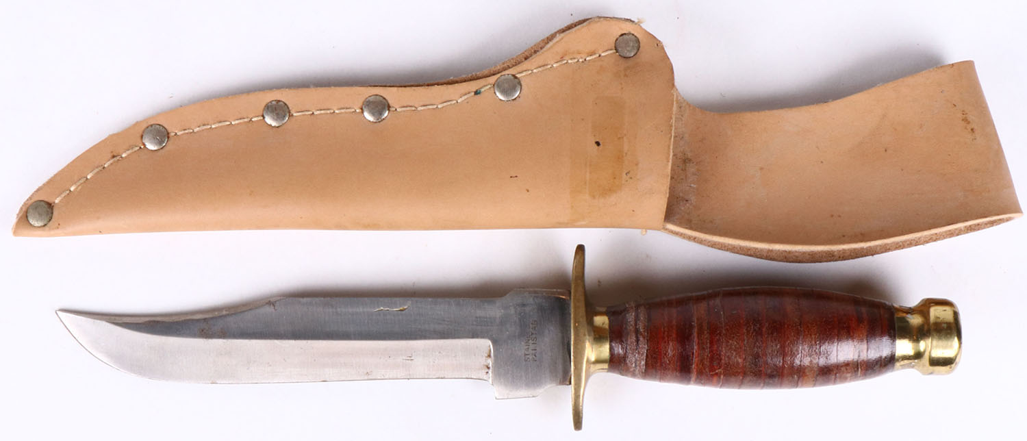 Unmarked fixed blade knife, wood handle, leather sheath, 6'' blade, age soiling. Grade: Very Good - Value: 10 to 60