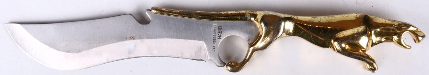 Fixed blade knife, tiger or cougar design for handle, has wear. Grade: Very Good - Value: 10 to 60