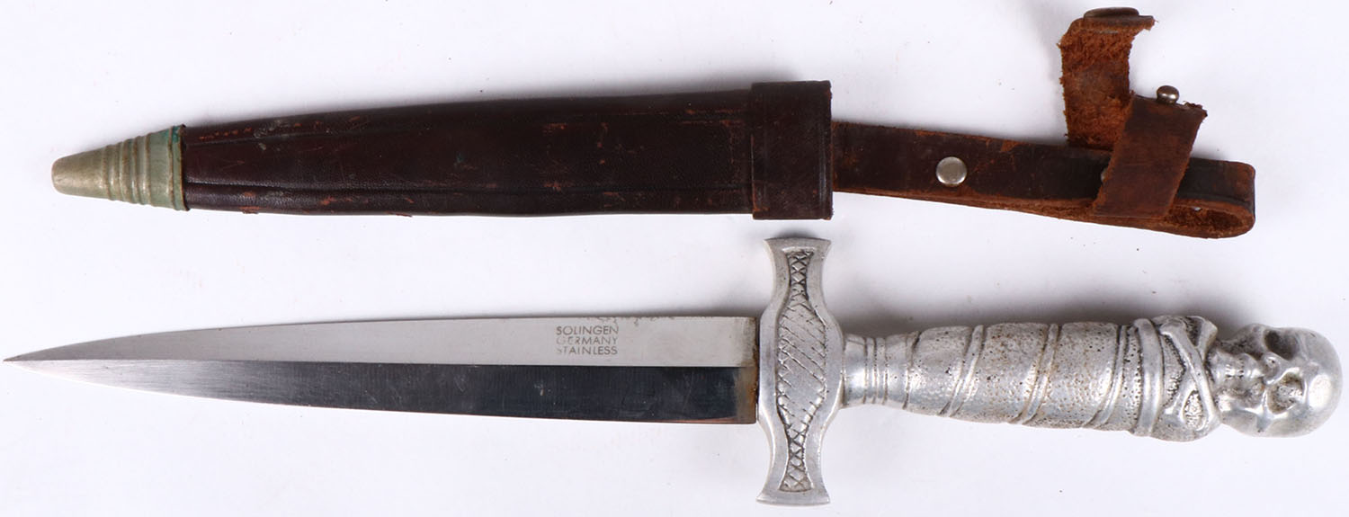 Foreign fixed blade knife, metal handle, leather sheath, brass hilt, 6'' blade. Grade: Excellent - Value: 6 to 60