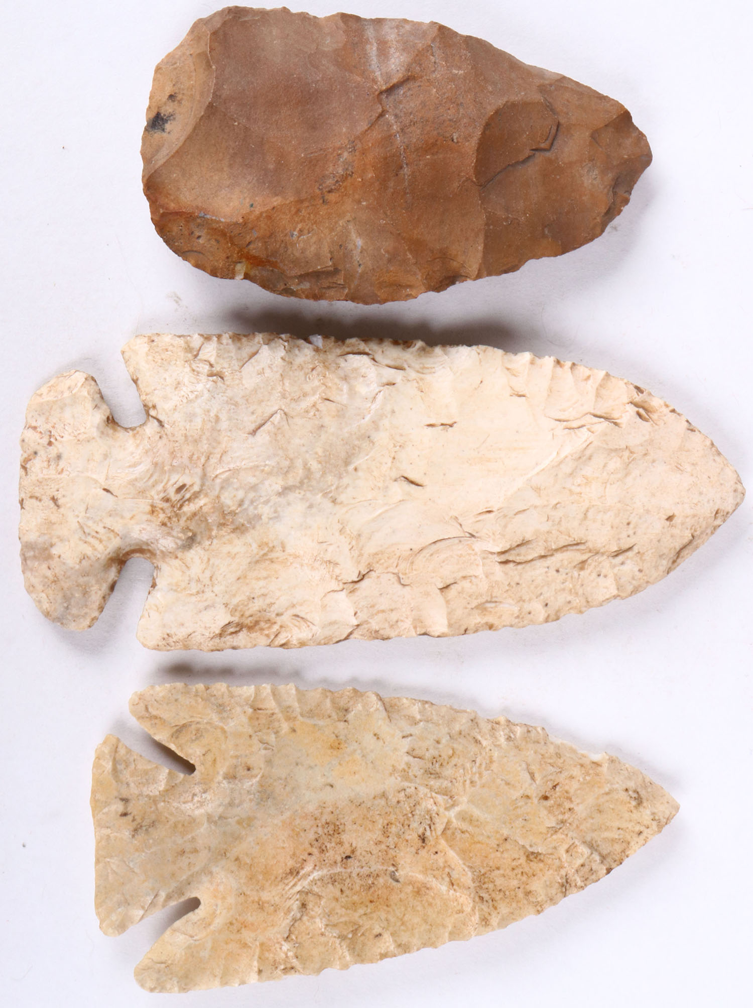 Lot of 3 flint spear tips. Grade: Excellent - Value: 6 to 60