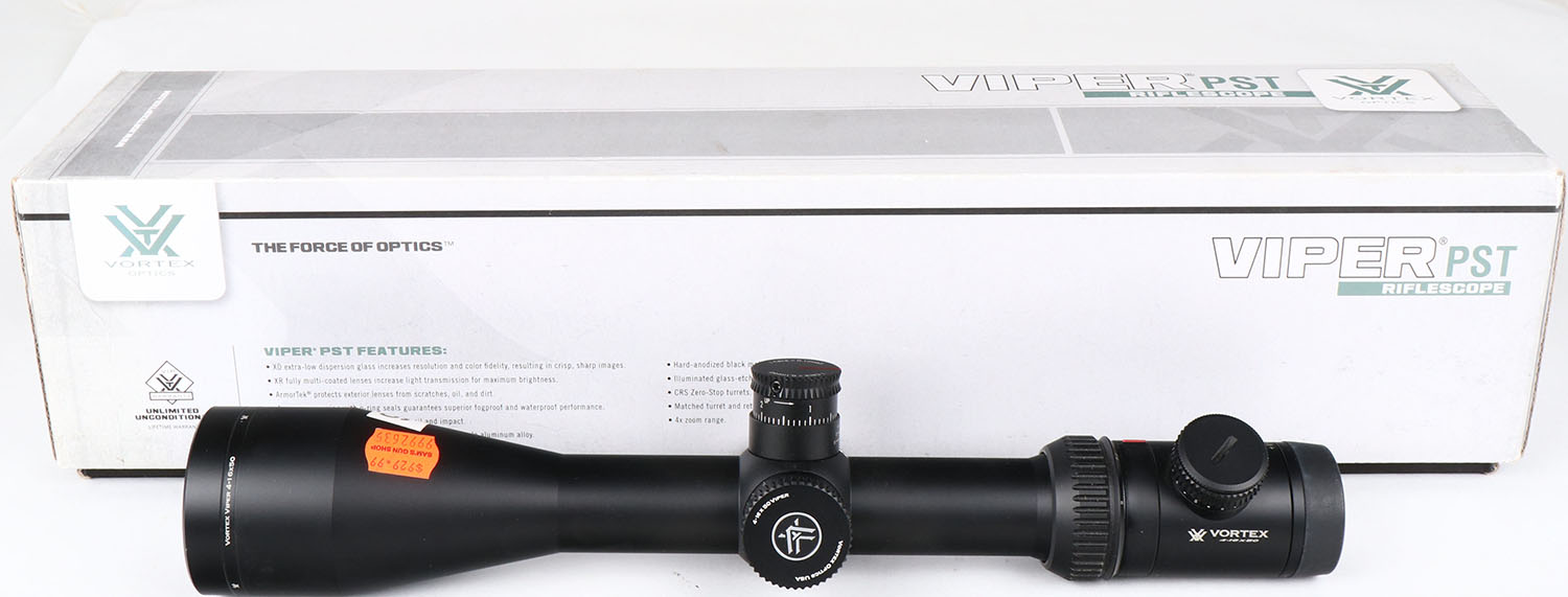 Viper, PST, 4-16 x 50mm Variable Magnification Rifle Scope, NIB, 30mm Tube Diameter, First Focal Plane EBR-1 (MOA) Illuminated Reticle, Adjustable Parallax from 50 Yards to Infinity, Fast Focus Eyepiece, Nitrogen Gas Purged Housing, Waterproof, Fogproof, Shock Proof, 4 Inches of eye relief, 13.7 Inches long, weighs 22.4 Ounces, Medium Height exposed locking turrets have 75 MOA of internal adjustment for elevation and windage, 1/4 MOA Clicks, very tight and positive and audible clicks with virtually no play between clicks, Fully Multi-Coated Glass is outstanding, comes with RZR Zero Stop, Sun Shade, Cleaning Cloth, CR2032 Battery, and the unmatched Vortex VIP Unconditional Warranty. Grade: MINT - Value: 400 to 1200
