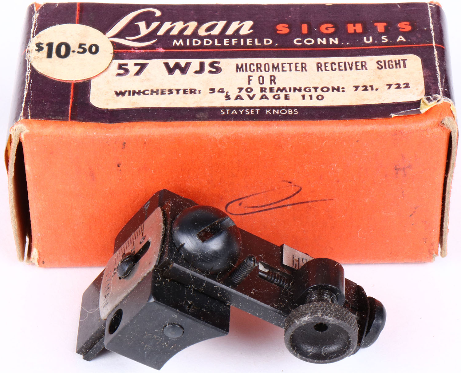 Lyman sight 57 WJS for Win mod 54 & 70, Rem 721, 722 & Sav 110, in orignal box, with screws, direction sheet & tissue. Grade: Excellent - Value: 50 to 150