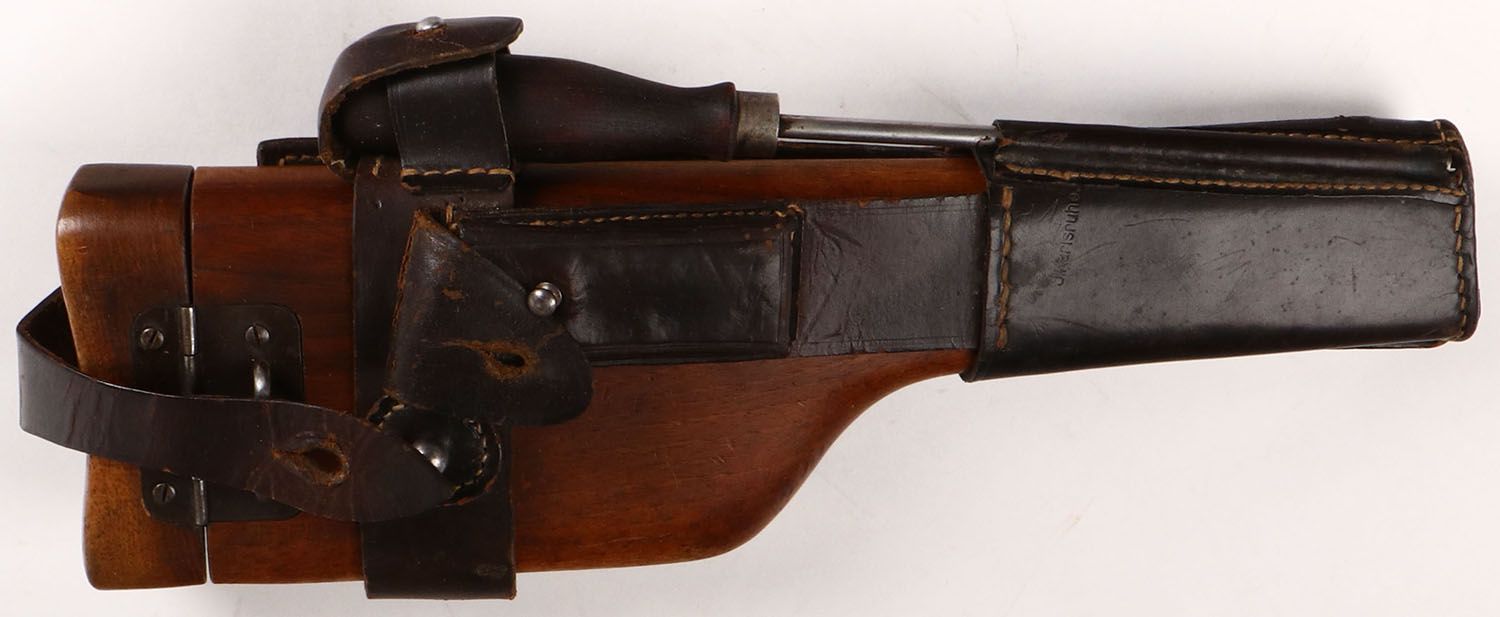 Wood and leather holster, foreign and marked 1918. Grade: Excellent - Value: 40 to 200