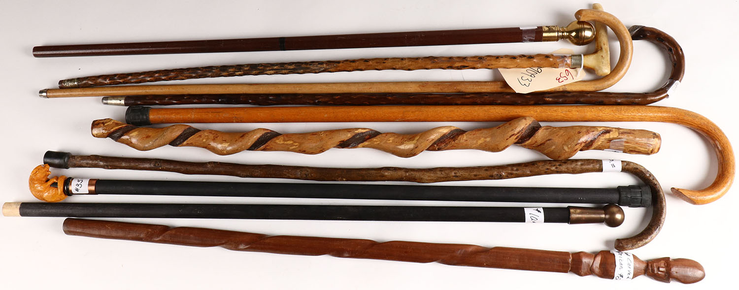 Large lot of walking canes, various styles all solid. Grade: Very Good ++ - Value: 10 to 100