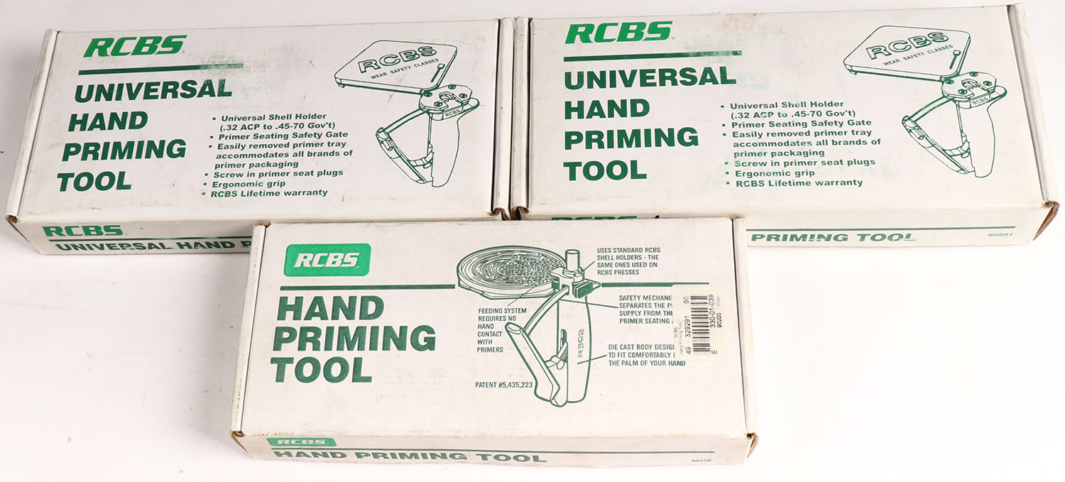 Lot of 3 RCBS universal hand priming tool, in orignal box. Grade: Excellent - Value: 4 to 40