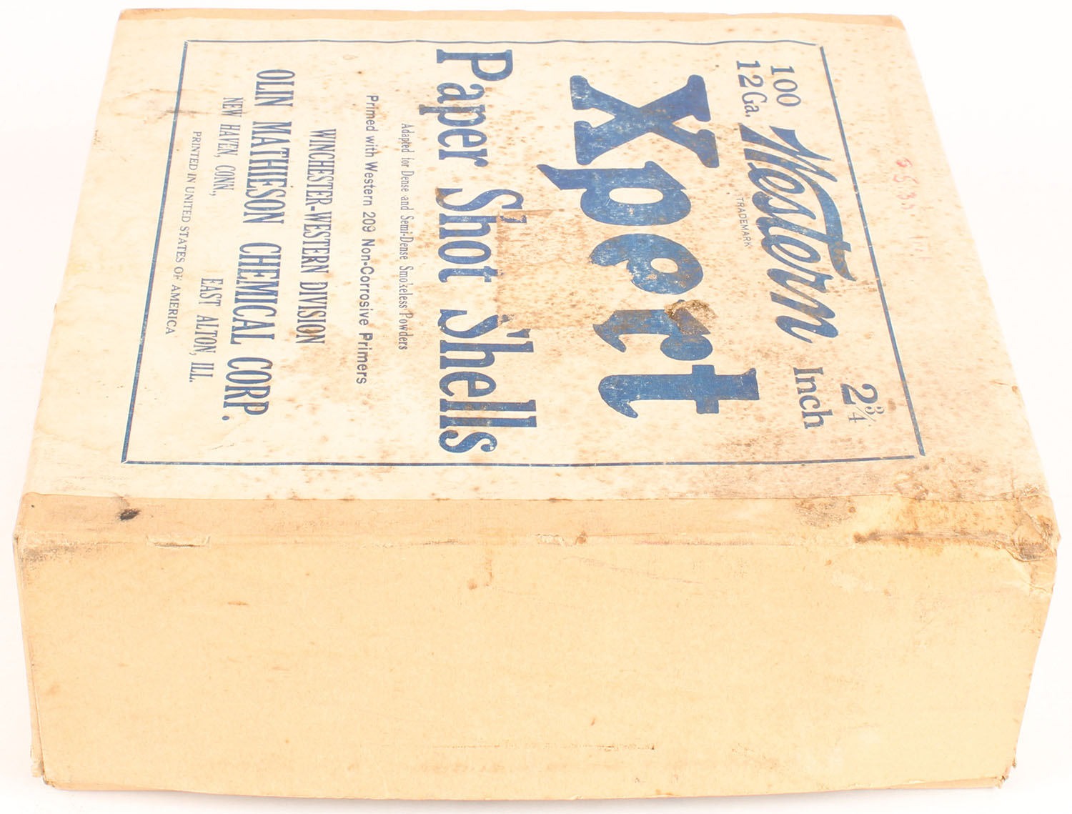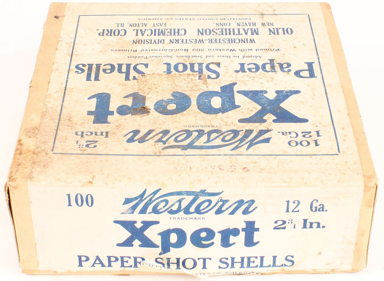 Western, XPERT, 12ga., 2pc., Partial 84%, buff box with white & blue label, 2 3/4 Inch, 100 count, paper shot shells, box & label are very solid, box has soiling with small puncture on top, Shells are excellent. Grade: Very Good ++ - Value: 50 to 100