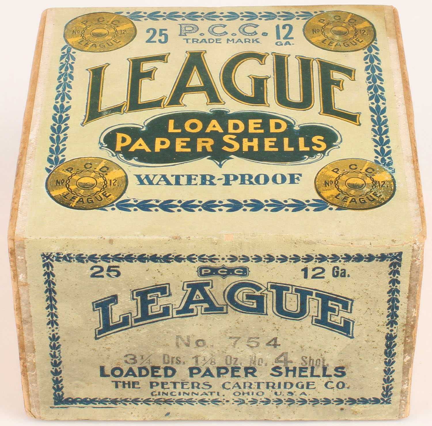 Peters Cart. Co., LEAGUE, 12 ga., 2pc., Empty, shot size 4, buff box with light Green, blue & yellow & four gold shotshell heads in each corner, Loading: No. 754, 3 1/4 Drs. 1 1/8 Oz. No. 4 Shot, box is very solid with light soiling and light scuffing, label is 100% intact. Grade: Excellent ++ - Value: 250 to 800