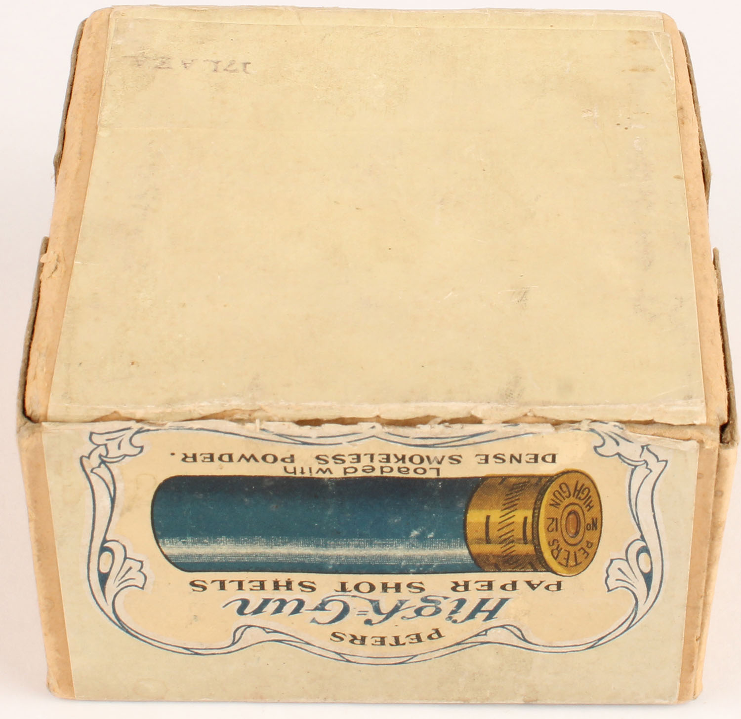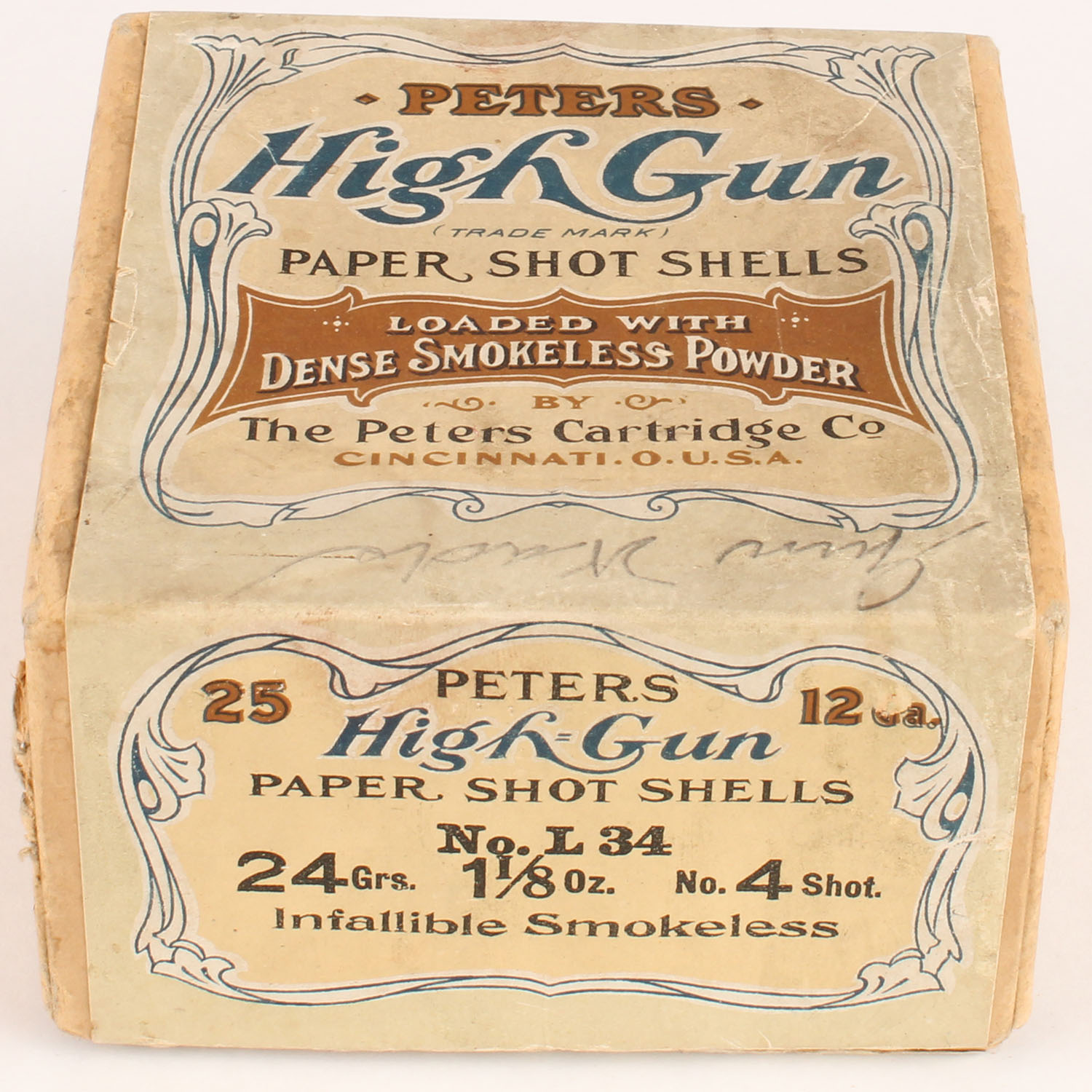 Peters Cart. Co., HIGH GUN, 12ga, 2pc., Empty, shot size 4 Shot, buff box with cream, blue and tan label. Infallible Smokeless, box with light age soiling and seam split with great color to label, label 100% original. Grade: Excellent + - Value: 1000 to 3000