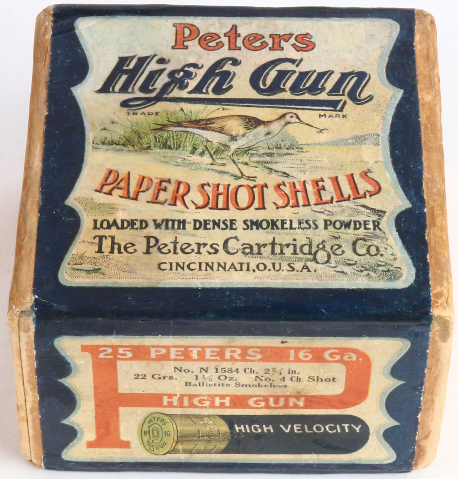 Peters Cart. Co., HIGH GUN, 16ga, 2pc., FULL & Professionally RESEALED/Restored, shot size 4CH Shot, buff box with multi colored picture of Snipe, Loading: No. N 1584, 22 Grs., 1 1/8 Oz. No. 4 Ch Shot, Ballistite Smokeless, box has great color to label. * Grade: Excellent + - Value: 1000 to 5000