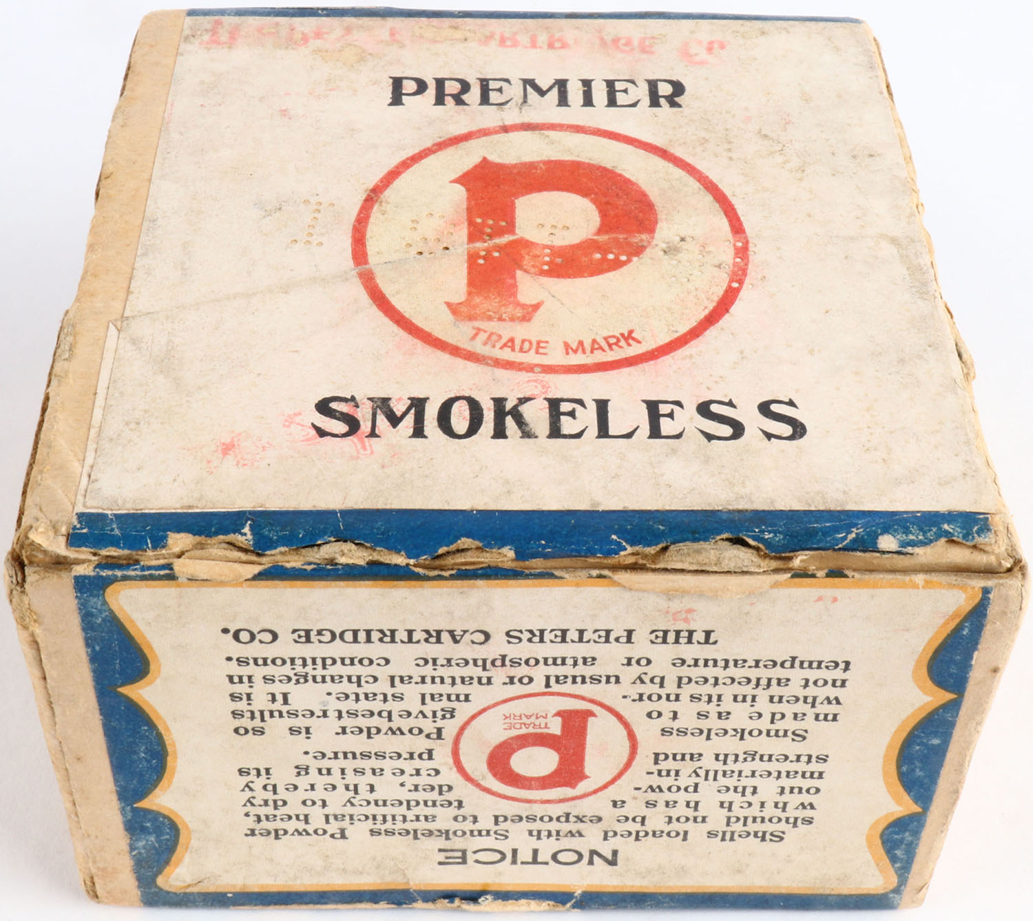 Peters Cart. Co. PREMIER, 16ga., 2pc., FULL & HALF SEALED, shot size 7 1/2, buff box with multi colored label that pictures a flying Prairie Chicken, box has edge wear & light shell protrusions with label being correct but having age soiling. Grade: Excellent - Value: 500 to 2000