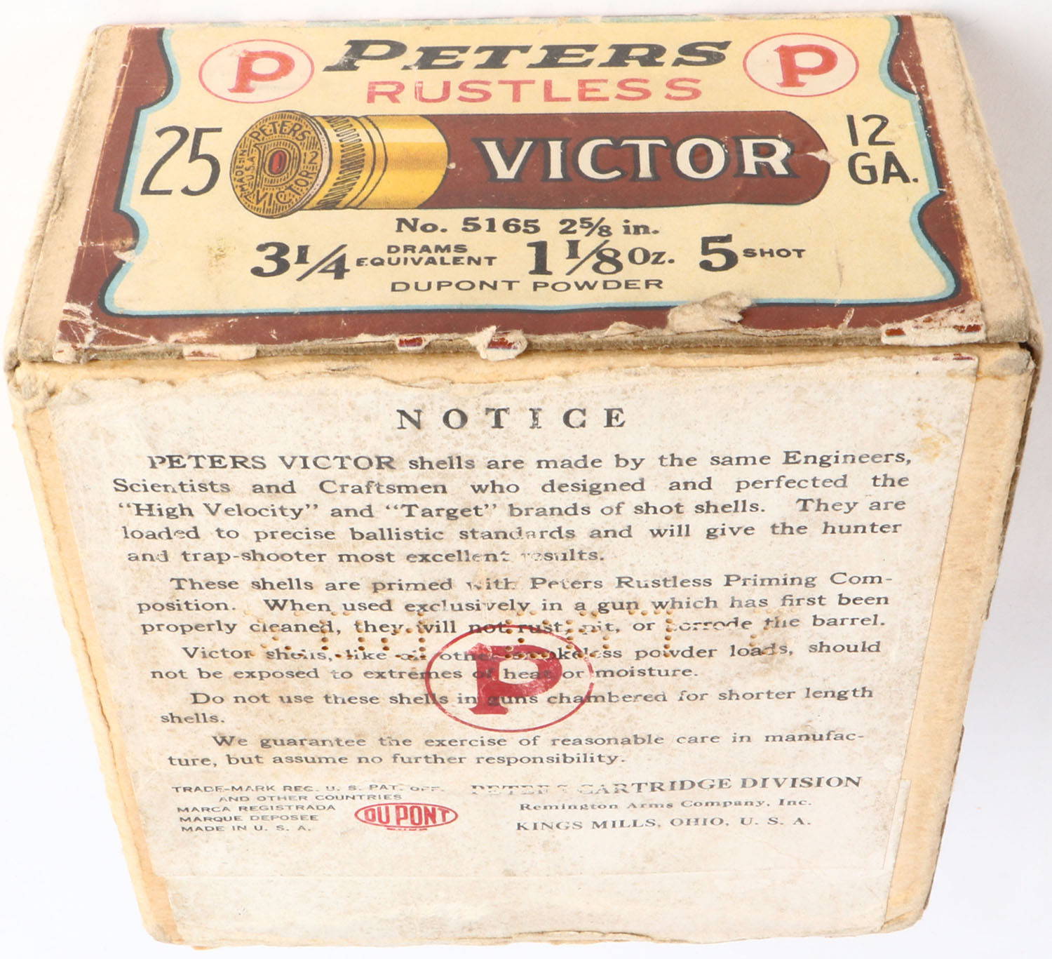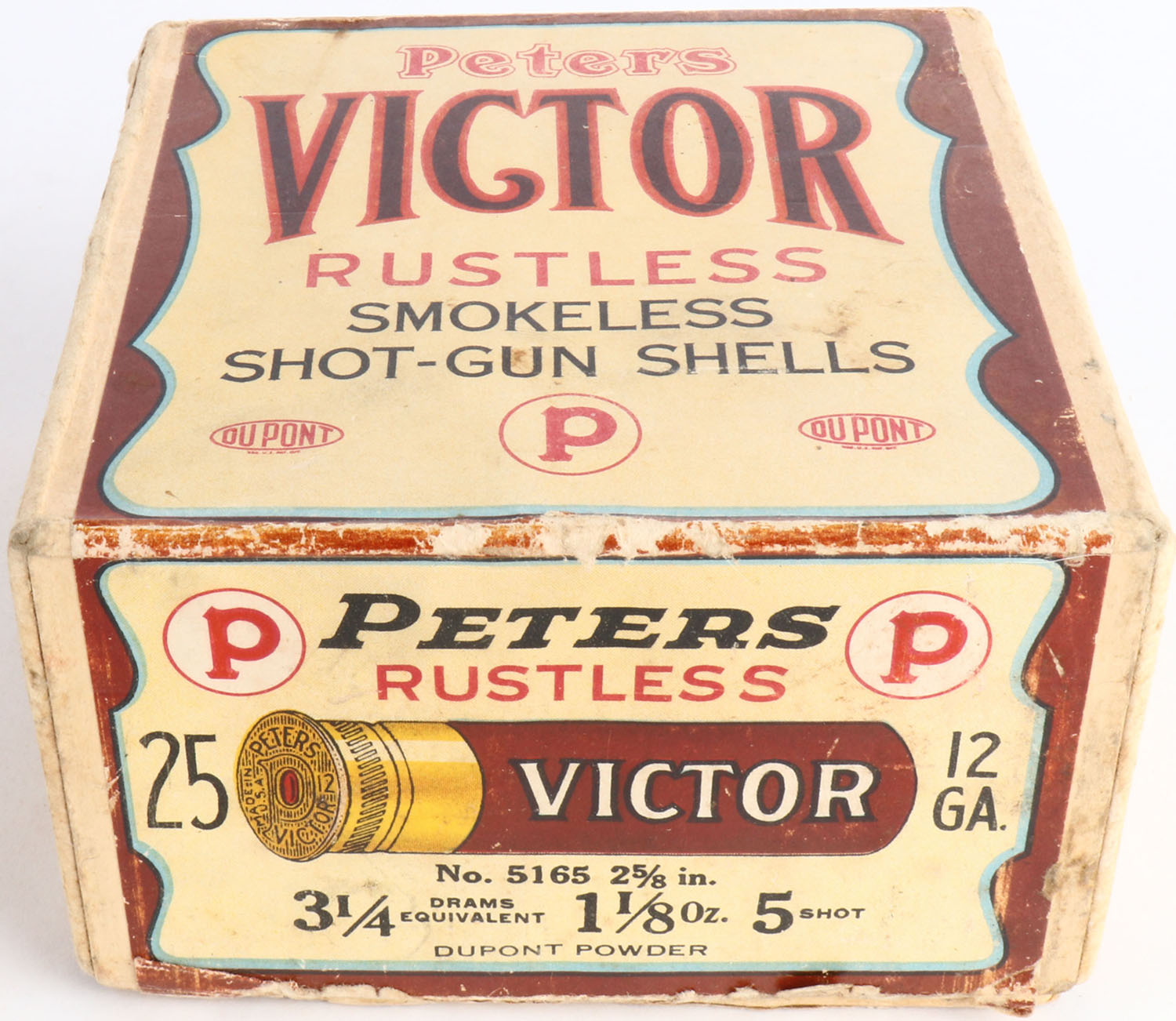 Peters Cart. Co., Victor, Rustless, 12ga., 2 5/8'', 2pc., Full, shot size 5, buff box with brown, cream & black label, box is solid with edge wear & light soiling with a very good label, Shells are excellent. Grade: Excellent - Value: 50 to 250