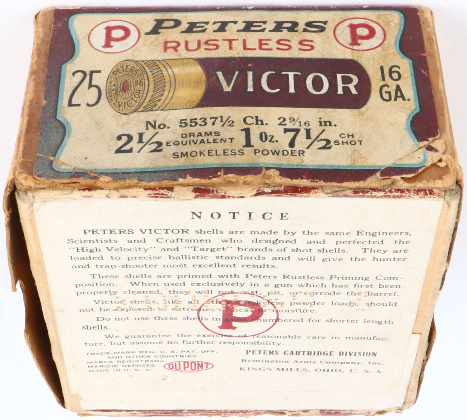 Peters Cart. Co., Victor, Rustless, 16ga., 2 9/16'', 2pc., Empty, shot size 7 1/2 CH, buff box with brown, cream & black label, box is solid with age soiling, edge wear & light scuffing, box has good label & colors are nice. Grade: Very Good ++ - Value: 40 to 250