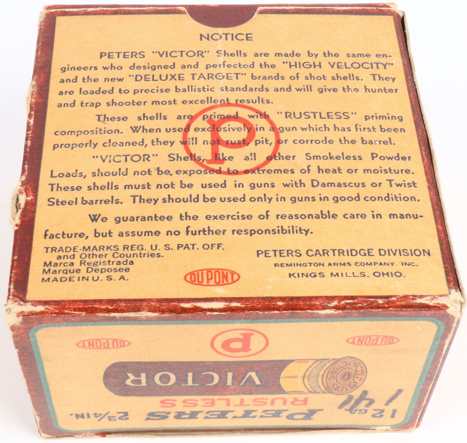 Peters, Victor, U.S. Property 12ga, 1pc., Full, shot size 00 Buck, Maroon, cream & orange box, 2 3/4'', box has light edge wear, shell protrusions & light soiling with great colors, Shells are excellent. Grade: Excellent - Value: 40 to 80