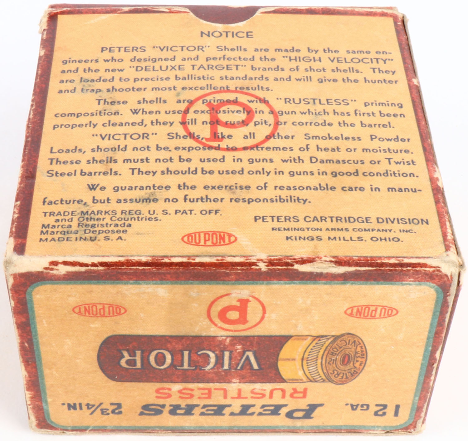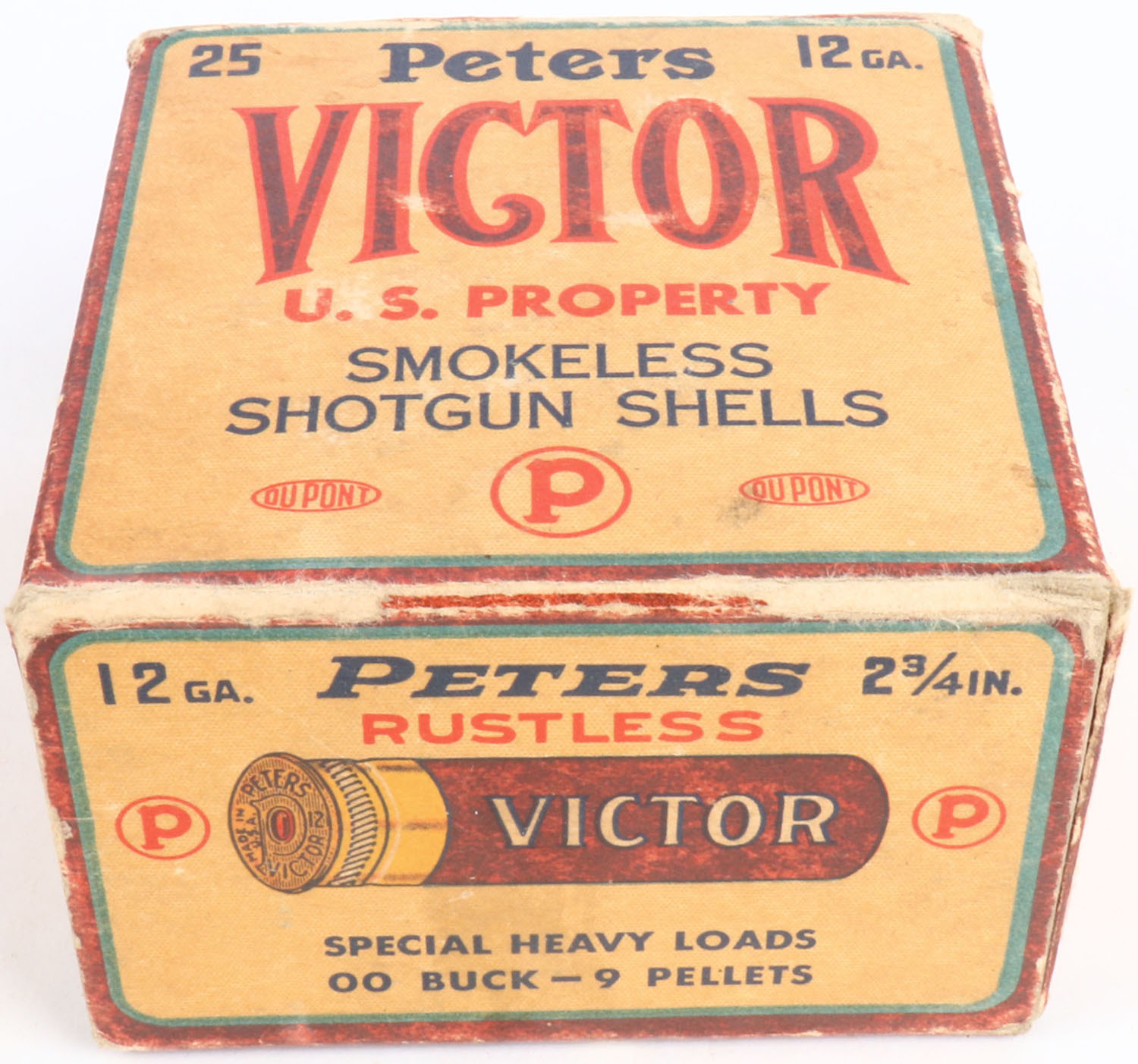 Peters, Victor, U.S. Property 12ga, 1pc., Full, shot size 00 Buck, Maroon, cream & orange box, 2 3/4'', box has edge wear & light soiling with great colors, Shells are excellent. Grade: Excellent - Value: 40 to 80