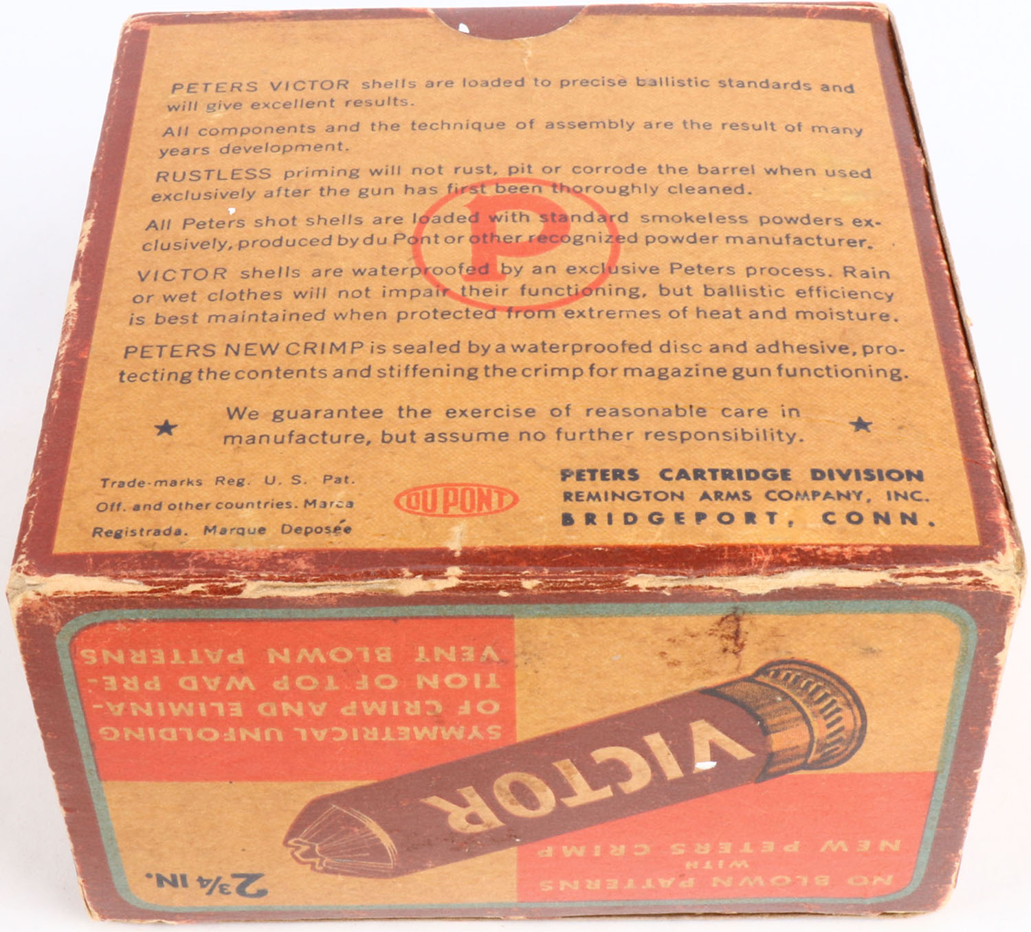 Peters, Victor, 12ga, 1pc., Empty, shot size 8, Maroon, cream & orange box, 2 3/4'', box has light edge wear & light soiling with some fading. Grade: Very Good ++ - Value: 20 to 40
