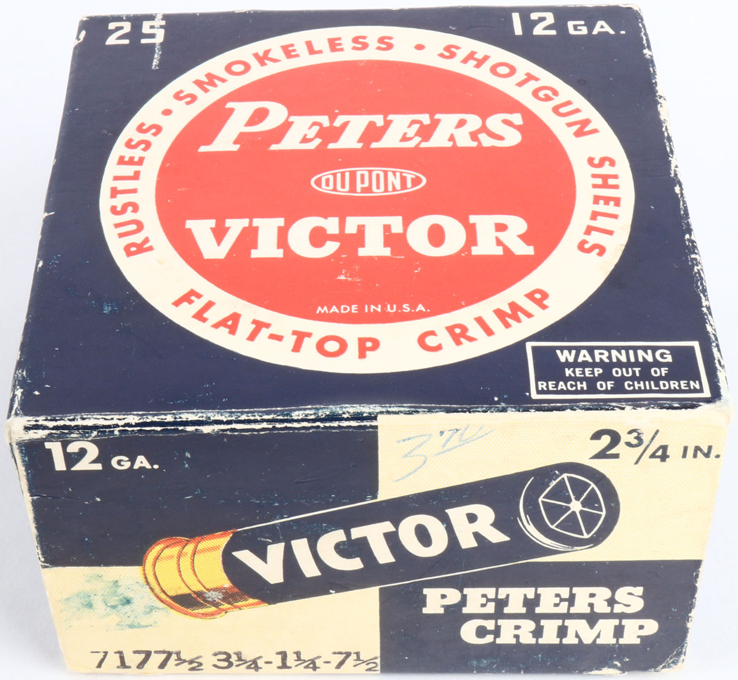Peters, VICTOR, 12ga., 1pc., Full, shot size 7 1/2, blue, white & red box, box has great color with light edge wear & light scuffing, shells are excellent. Grade: Excellent - Value: 10 to 40