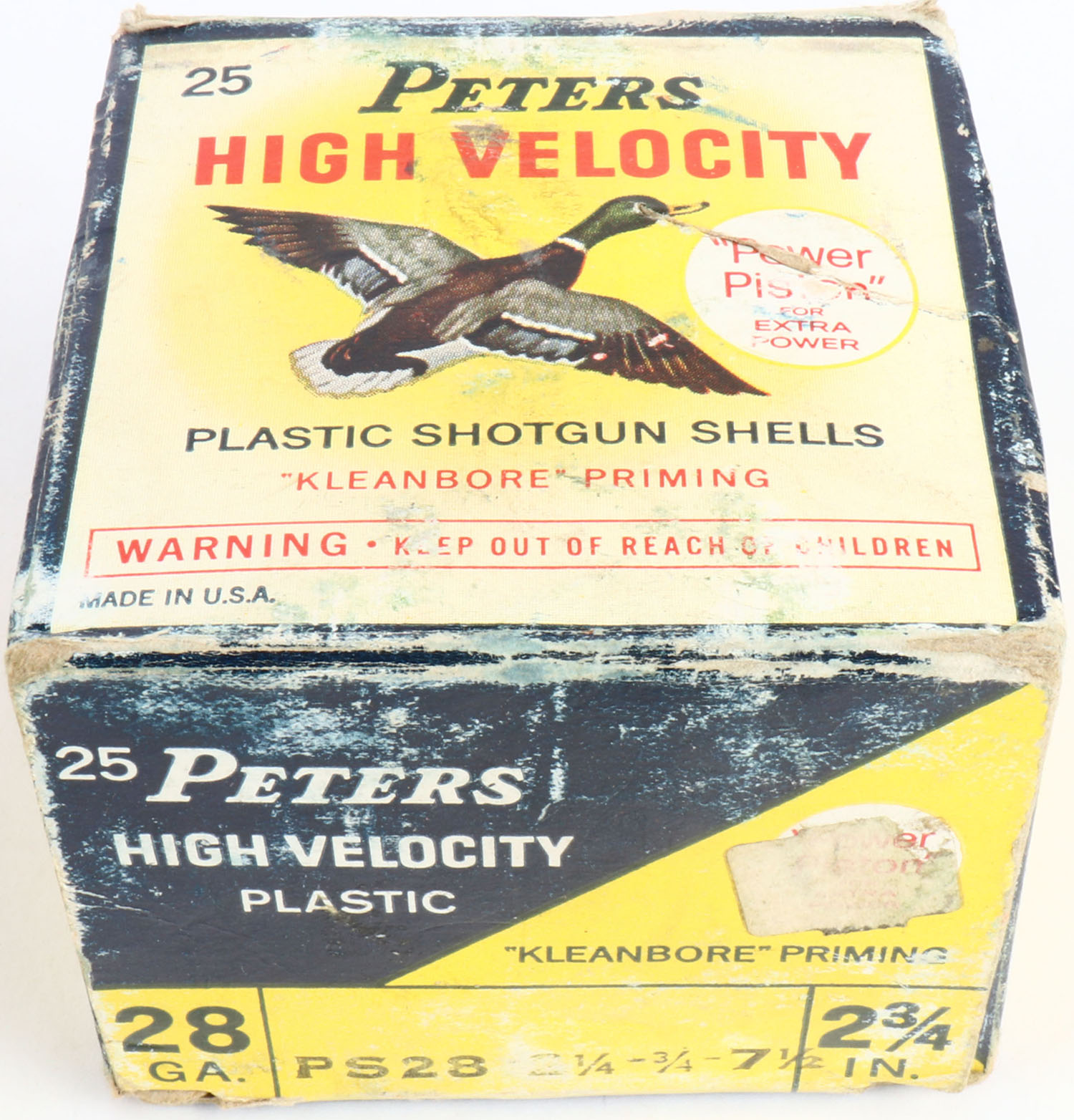 Peters Cart. Co., High Velocity, 28ga, 2 3/4'', 1pc., Partial 24rds with only 7rds being correct, shot size 7 1/2, multi colored box that pictures mallard flying, box is solid with edge wear, scuffing, soiling & very nice color, shells are good. Grade: Very Good + - Value: 8 to 30