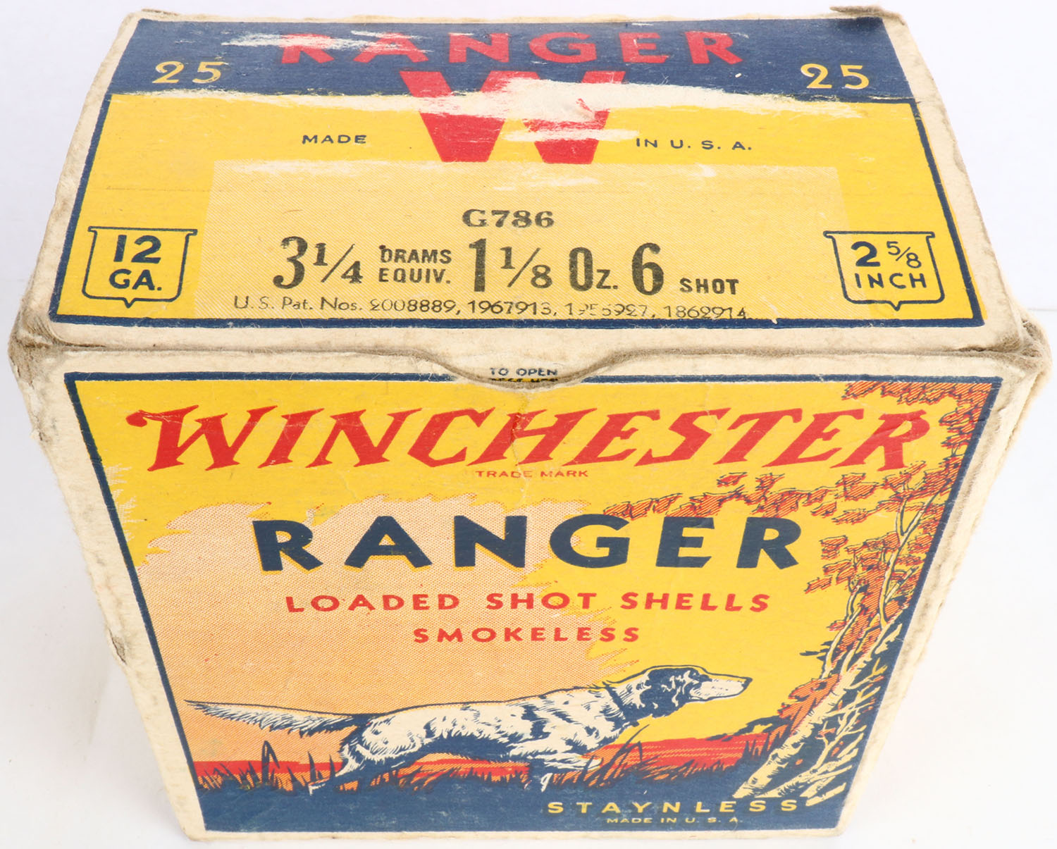 Winchester, Ranger, 12ga, 1pc., Empty, shot size 6, multi colored box, dog on point, shells 2 5/8'', box is solid with light scuffing, light edge wear & great colors. Grade: Excellent - Value: 20 to 60