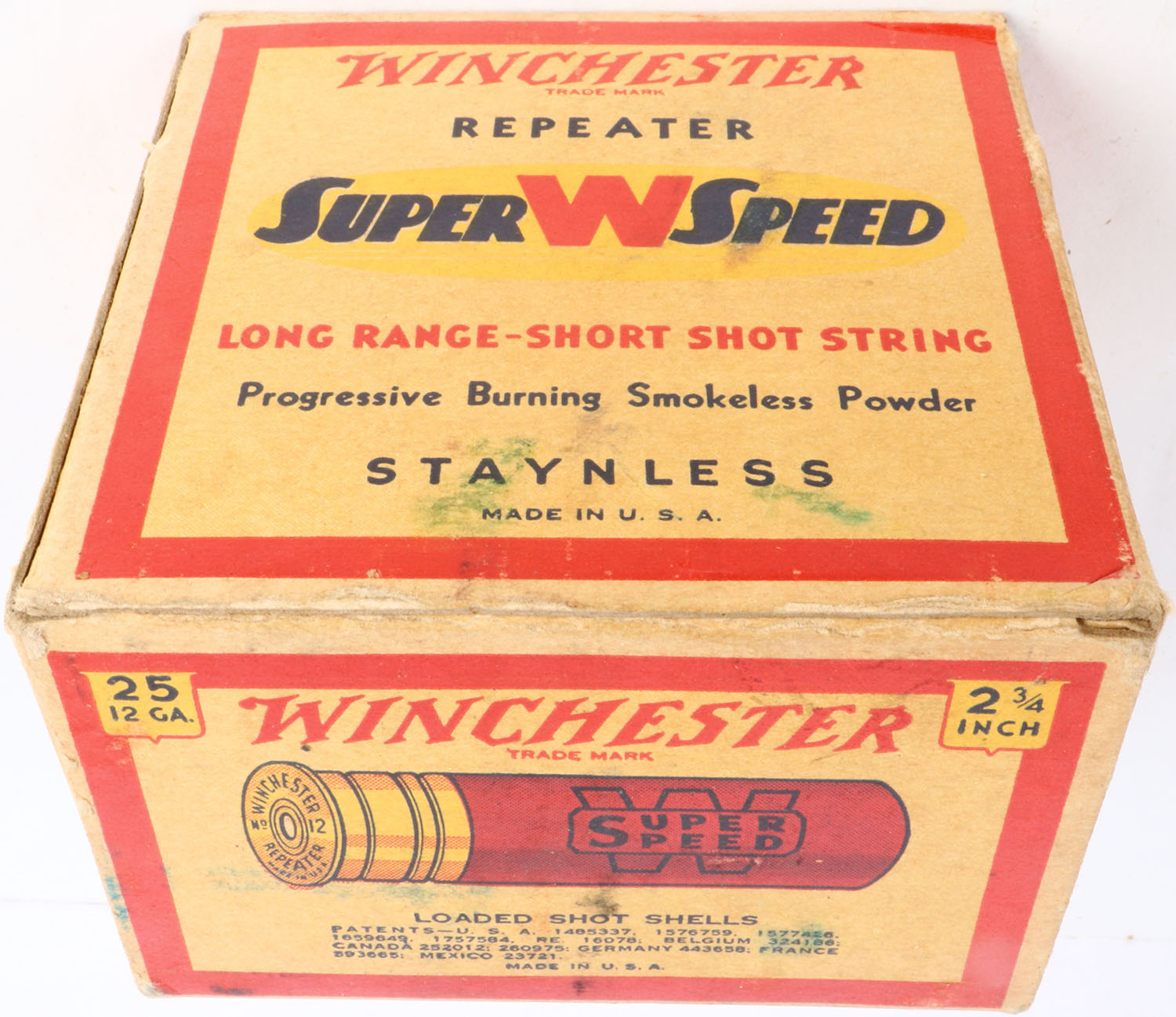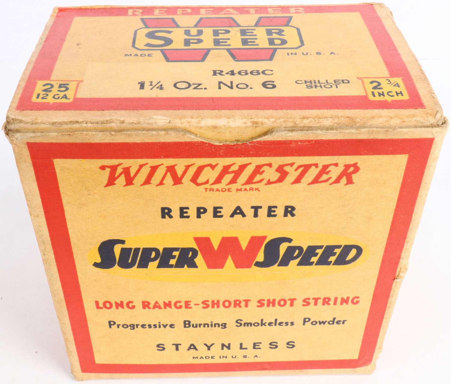 Winchester, Super W Speed REPEATER, 12ga., Staynless, 2 3/4'', 1pc., Partial 22rds, shot size 6 Chilled Shot, cream, red, blue and yellow box, box is very solid with light soiling, light edge wear, light scuffing & great colors, shells are excellent. Grade: Excellent + - Value: 16 to 40