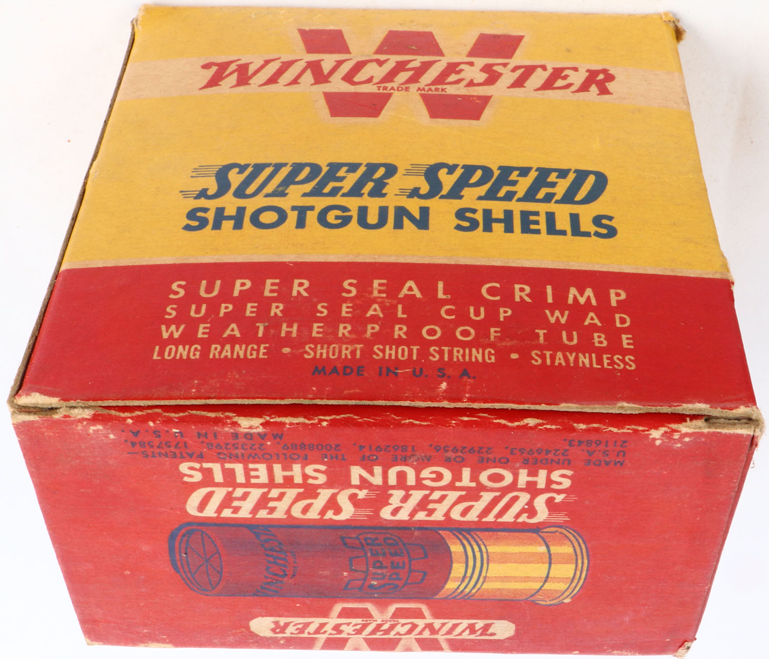 Winchester, Super Speed, 12ga., 1pc., Partial 12rds with two rounds being slightly different looking, 2 3/4'', shot size 6, red, yellow & blue box, box has light soiling, light edge wear with very nice colors, shells are excellent. Grade: Very Good ++ - Value: 8 to 30