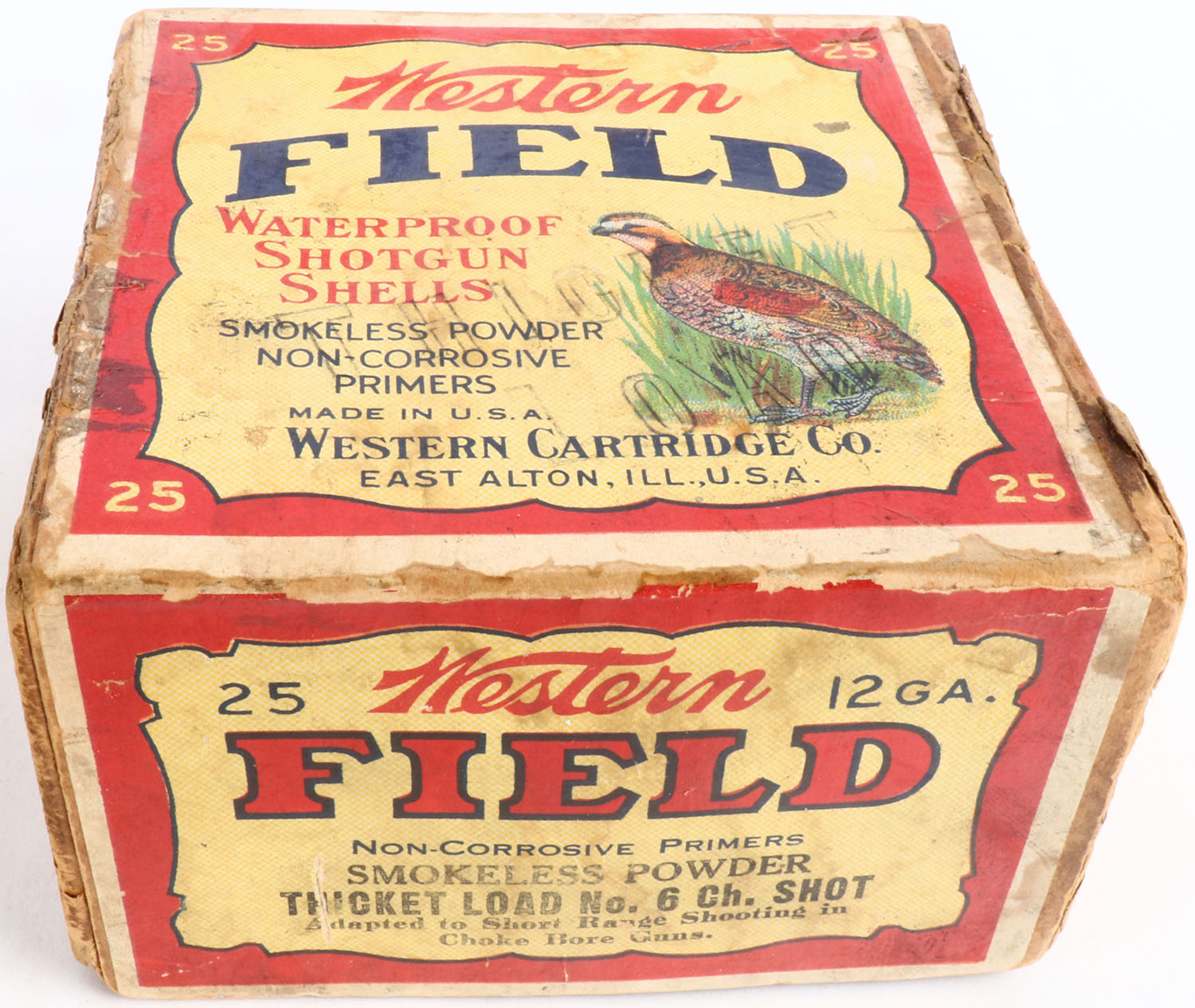 Western, Field, 12ga., 2pc., Empty, shot size 6 Ch Thicket Load, box has soiling, scuffing, tears & glue repair with very nice label. Grade: Very Good ++ - Value: 60 to 200