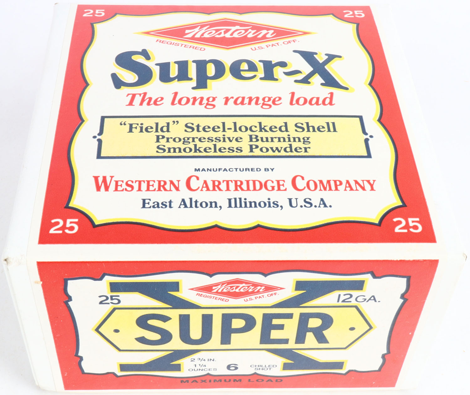 Western, Super-X, 12ga., 2pc., FULL & SEALED, shot size 6 Chilled Shot, 2 3/4'', white box with multi colored label, box & label are great, Circa 1990's. Grade: Excellent ++ - Value: 30 to 80