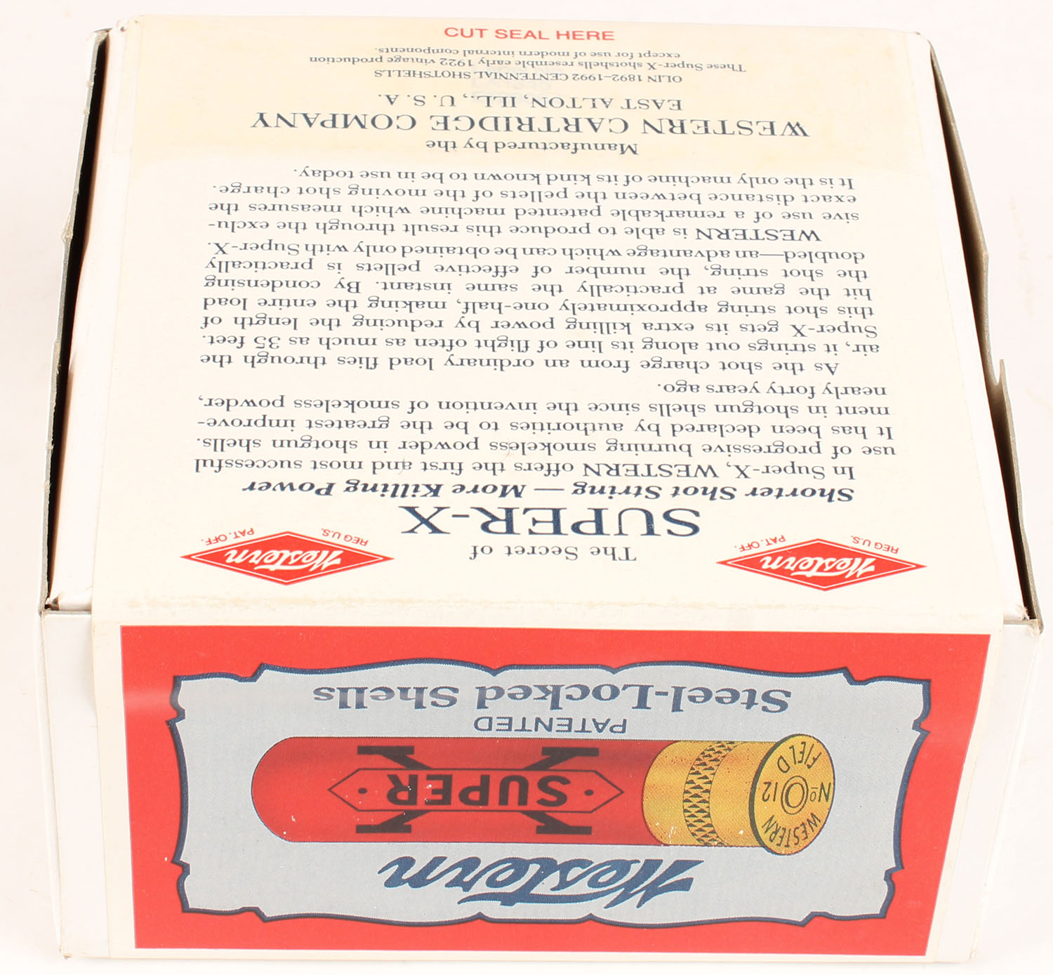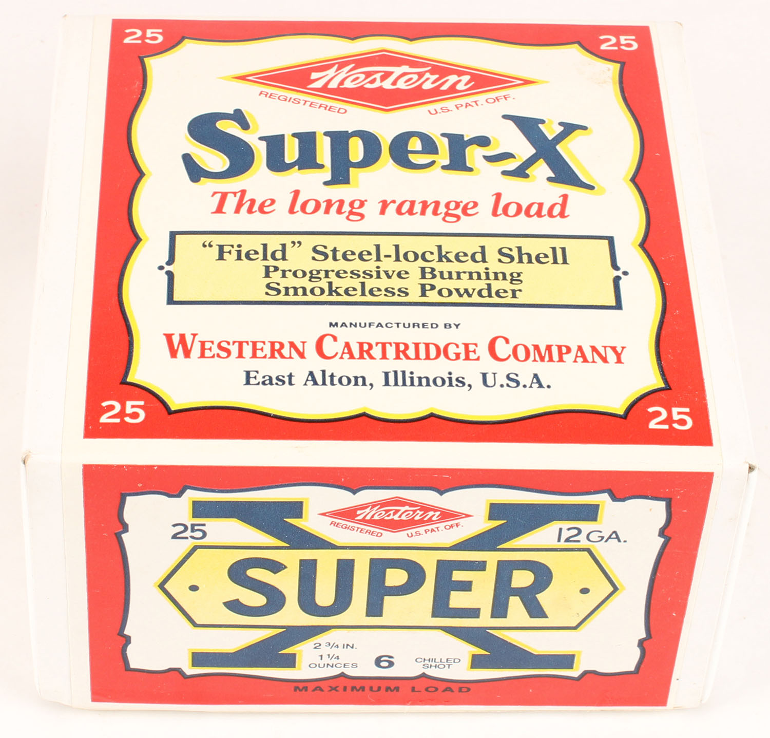 Western, Super-X, 12ga., 2pc., FULL & SEALED, shot size 6 Chilled Shot, 2 3/4'', white box with multi colored label, box & label are great, Circa 1990's. Grade: Excellent ++ - Value: 30 to 80