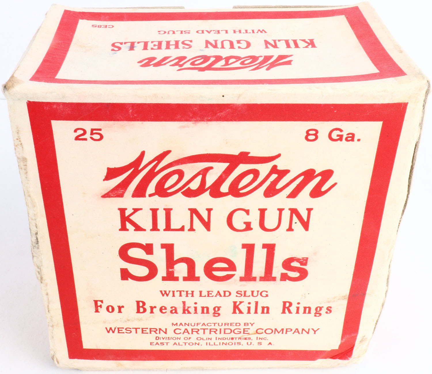 Western, Kiln Gun Shells, 8ga., 3'', 1pc., Full, shot size Lead Slug, cream & red box, box is solid with nice colors, box shows scuffing, shell protrusions & light edge wear, shells are good. Grade: Very Good ++ - Value: 40 to 150