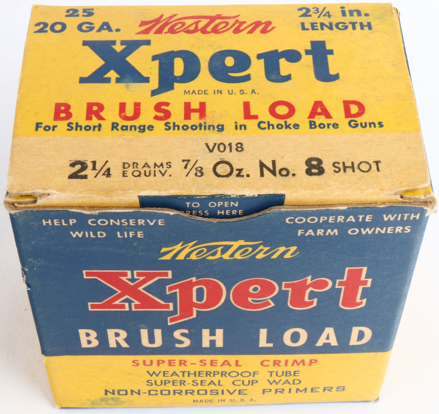 Western Xpert Brush Load, 20ga., 1pc., Partial 20rds., shot size 8, 2 3/4'', multi-colored box, box has light edge wear & great color, shells are excellent. Grade: Excellent - Value: 10 to 30