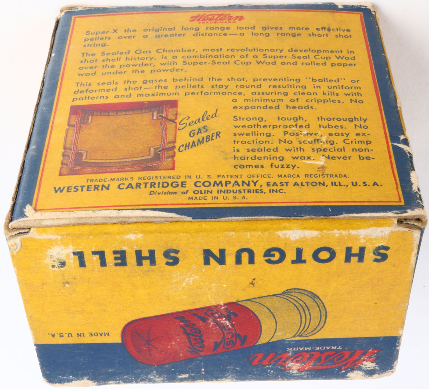 Western, Super X, 12ga., 3'', 1pc., Partial 21rds. With one being incorrect shot size, shot size 2 Magnum, multi-colored box, box is solid with edge wear & light age soiling, box has very nice colors, shells are excellent. Grade: Very Good ++ - Value: 10 to 30