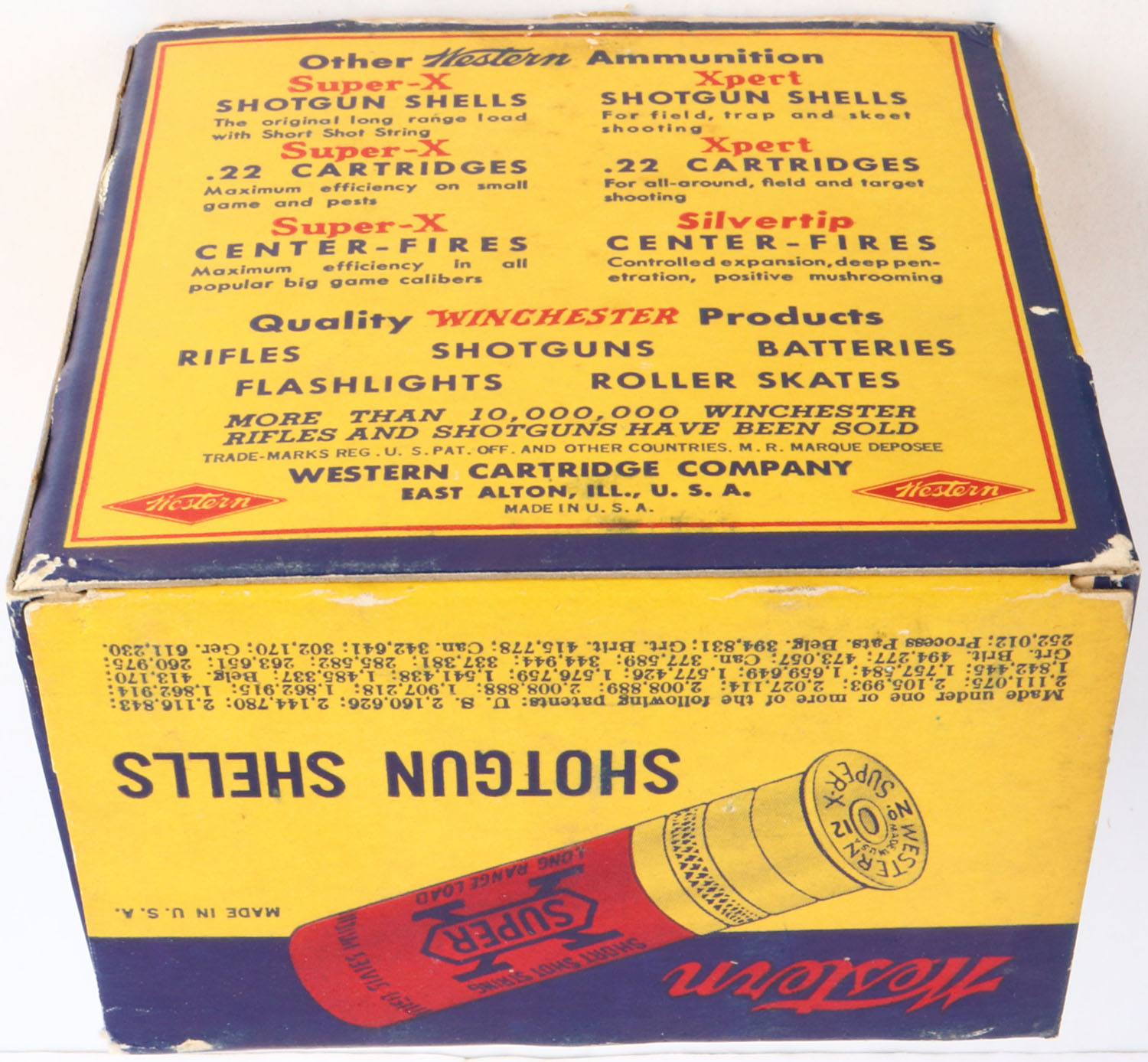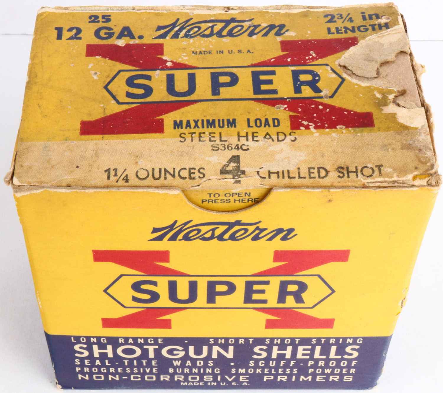 Western, Super X with insert, 12ga., 2 3/4'', 1pc., Full, shot size 4 Chilled, Steel Heads, multi-colored box, box has scuffing, disconnected inside flap & box has been reinforced with scrap cardboard, box has great colors, shells are excellent. Grade: Excellent - Value: 10 to 40