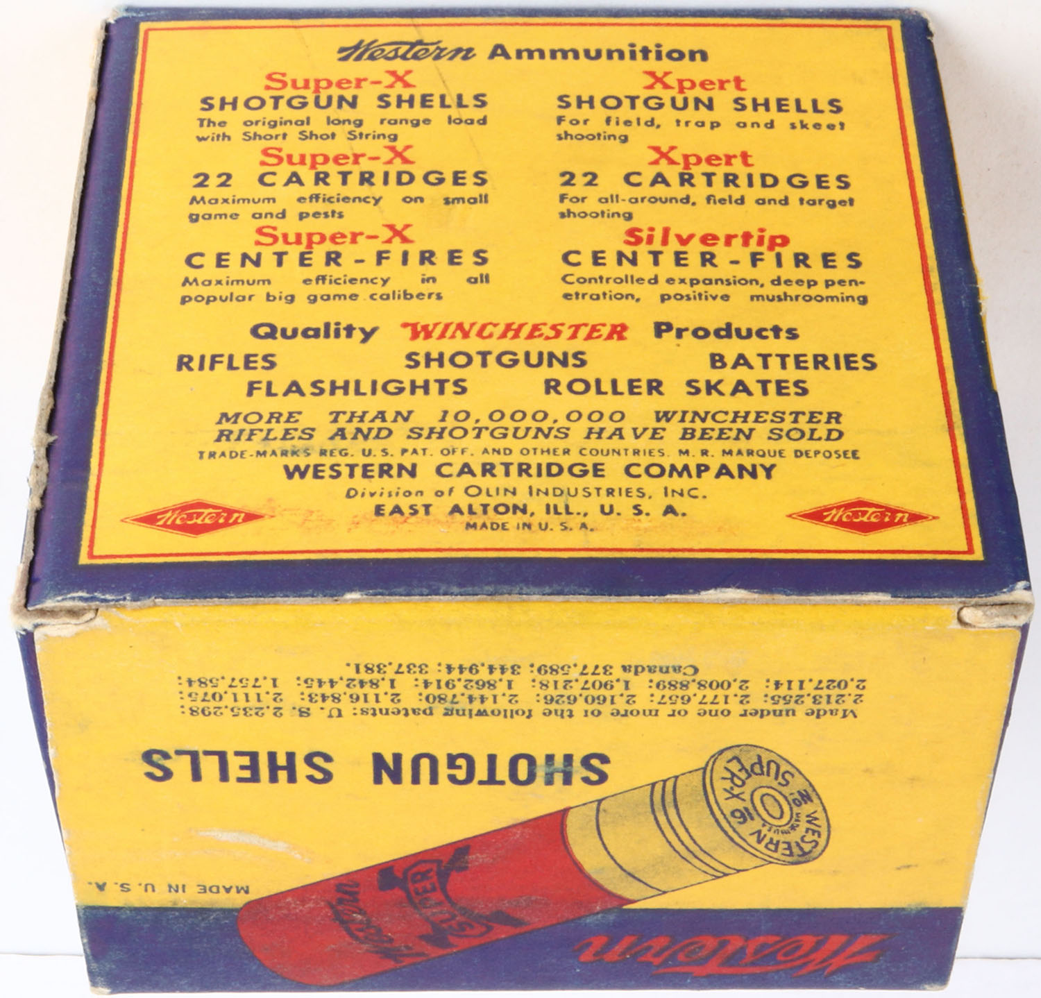 Western, Super X, 16ga., 2 9/16'', 1pc., Full, shot size 6, multi-colored box, box is solid with light soiling, box has great colors, shells are excellent. Grade: Excellent - Value: 10 to 30