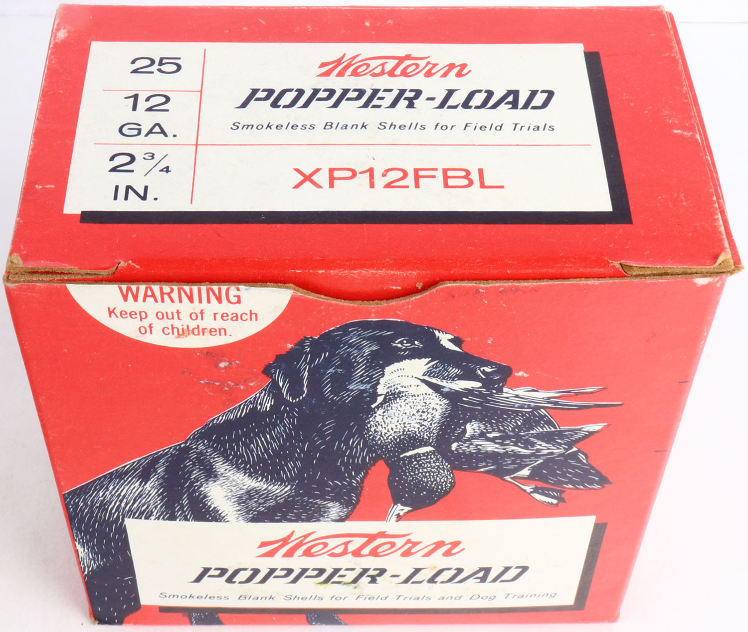 Western, POPPER-LOAD, 12ga., 1pc., Full, red, white & blue box, made for training dogs, Shells are excellent, great box. Grade: Excellent + - Value: 20 to 40