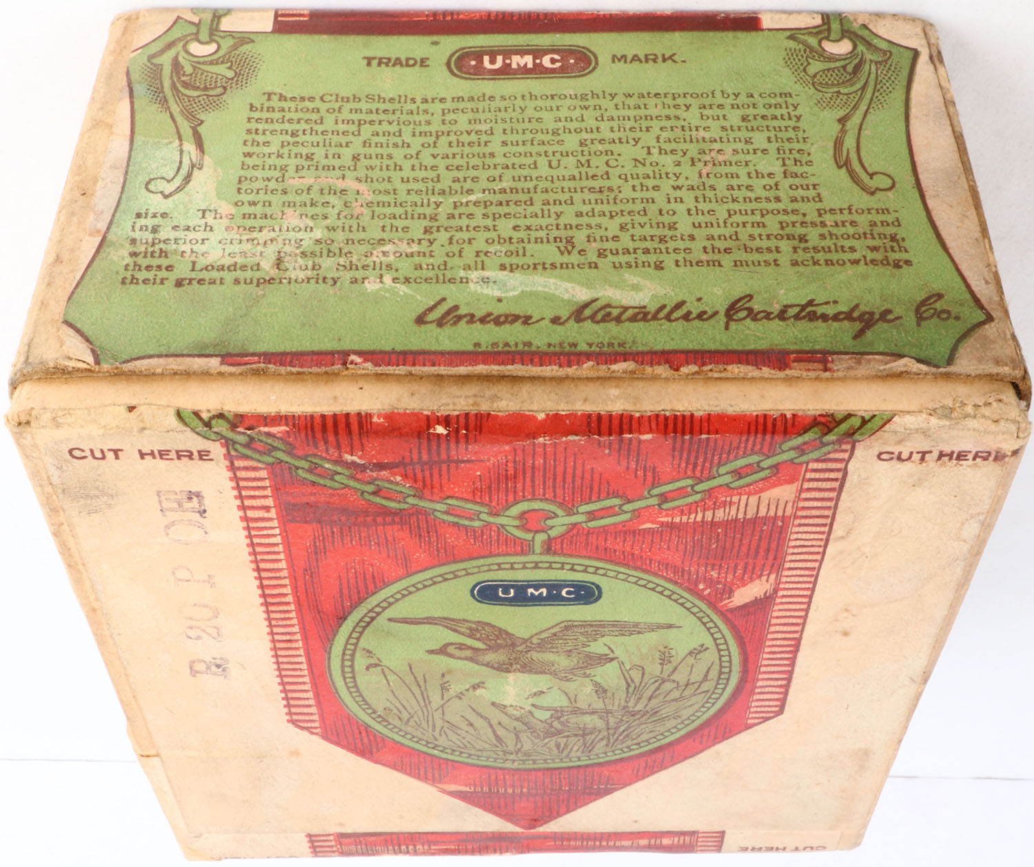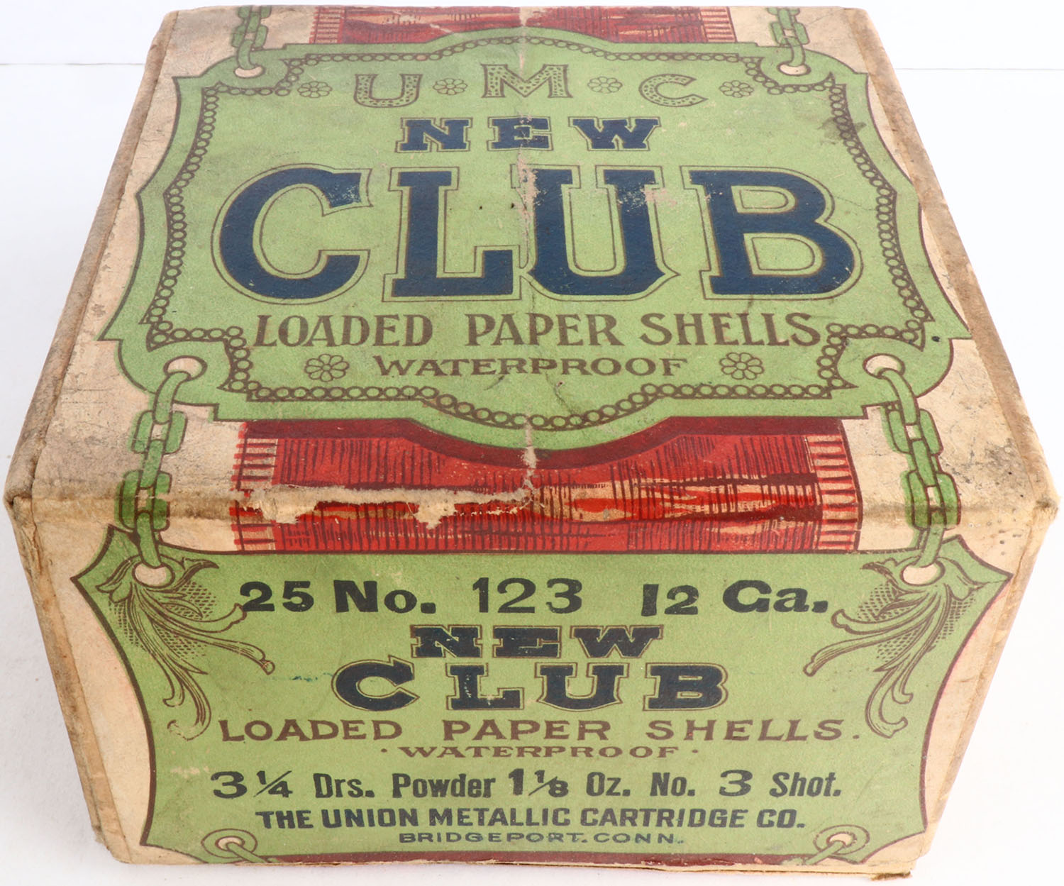 UMC, New Club, 12ga, 2pc., Empty, No. 3 Shot, buff box with blue, red, & green paper label, box has light scuffing with great colors to label, box has label on left side that states Loaded With Orange Extra Sporting by Laflin & Rand Powder Co. Grade: Excellent - Value: 50 to 250