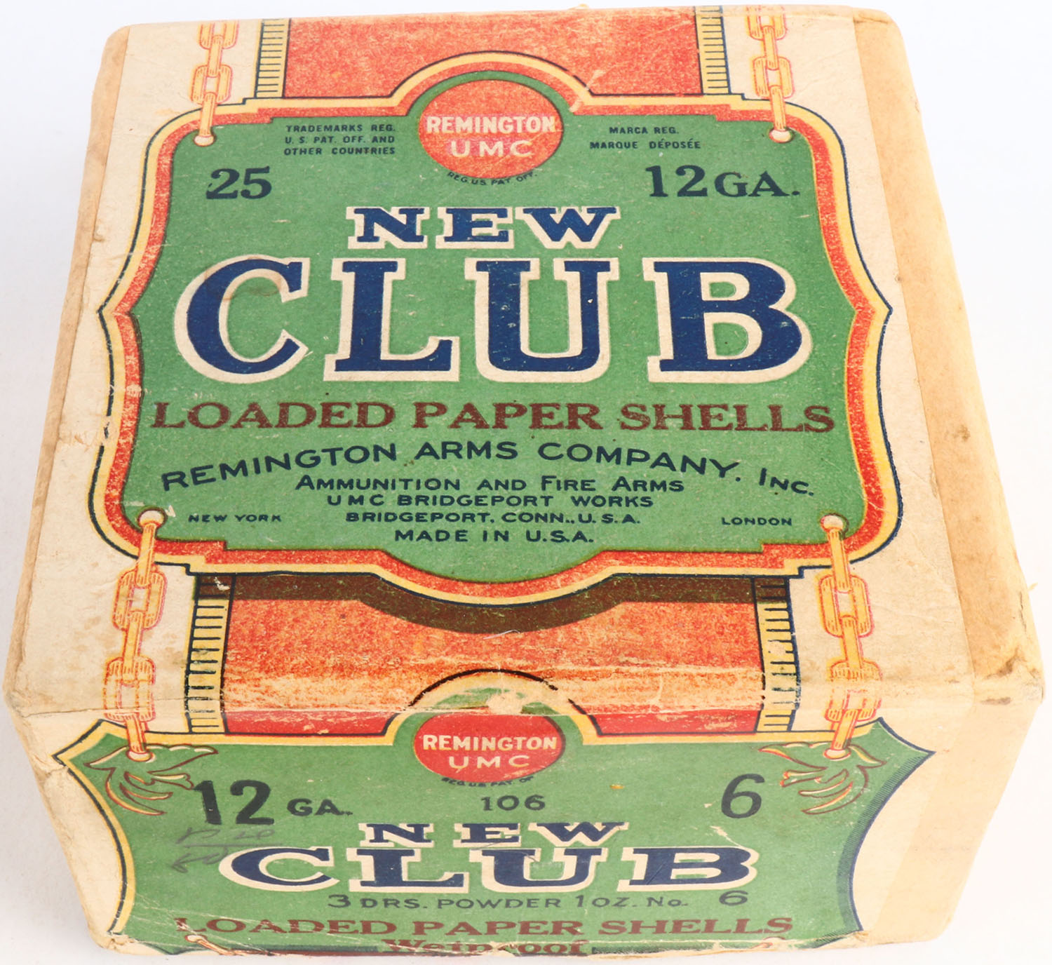 REM-UMC, New Club, 12ga, 2pc., Full with 8rds being correct shot size, shot size 6, buff box with green, yellow, blue & red paper label, with great colors to label box has small shell protrusions, Shells are poor. Grade: Excellent - Value: 30 to 150
