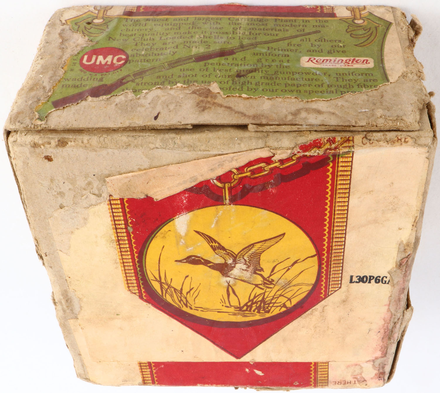 REM UMC, New Club, 12ga, 2pc., Empty, shot size 7, buff box with green, blue & red paper label, label is 85% intact, box has edge wear, scuffing & soiling with nice color to label. Grade: Very Good + - Value: 10 to 60