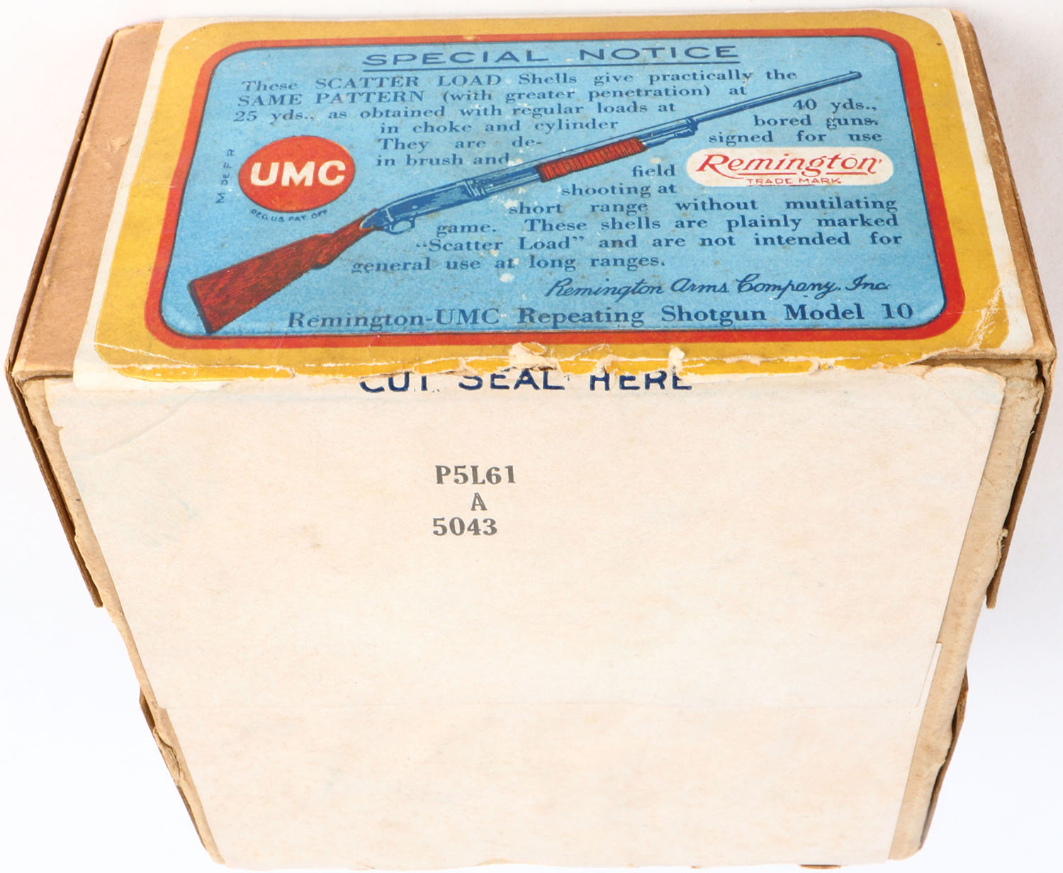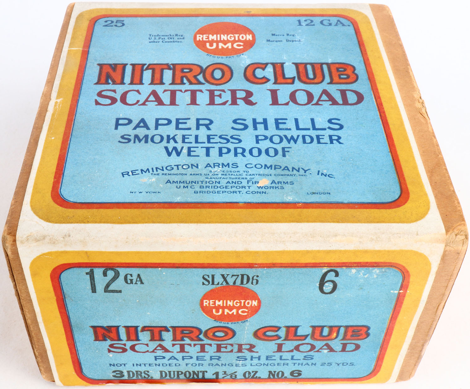 REM U.M.C. Nitro Club Scatter Load, 12ga., 2pc., Empty, shot size 6, buff box with blue, yellow, and red colors, box is very solid with great colors to label. Grade: Excellent ++ - Value: 70 to 300