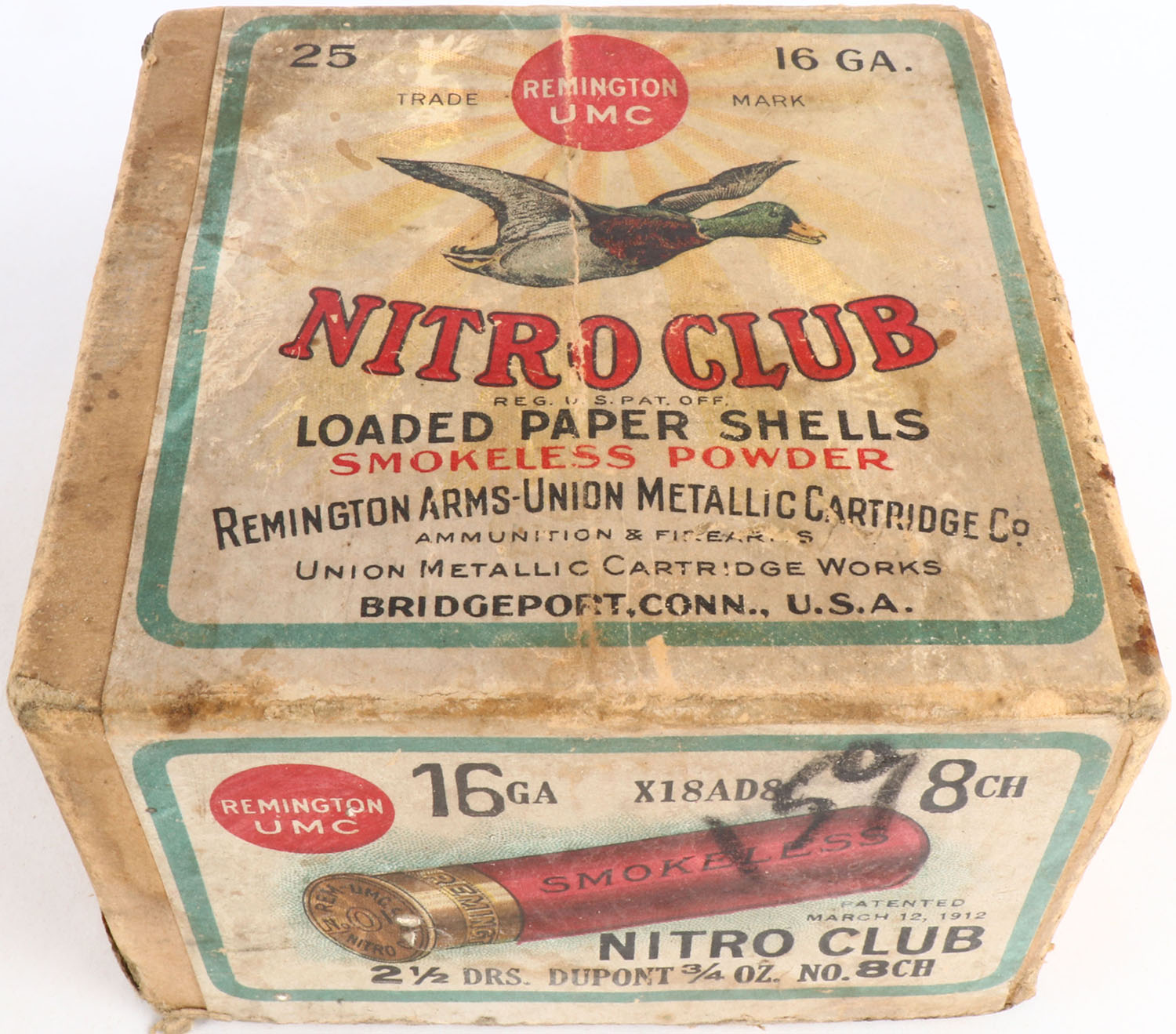 REM UMC, Nitro Club, 12ga., 2pc., Full with 9rds being correct shot size, shot size 8 CH Steel Lined, buff box with sunburst logo & Mallard flying on top box has nice colors to label with age soiling, edge wear & tape repair, Shells are very good. Grade: Very Good ++ - Value: 20 to 100