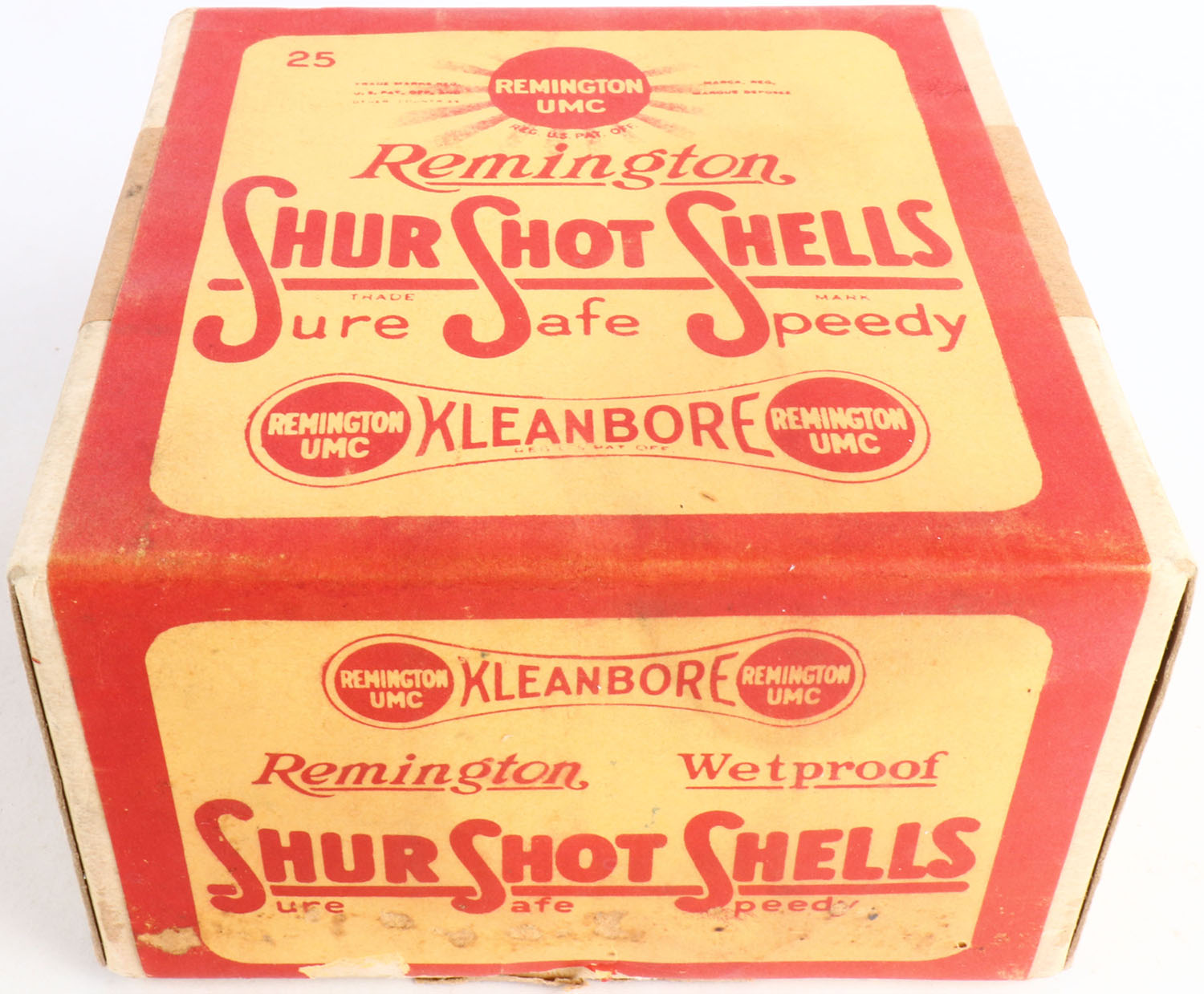 Remington UMC, Shur Shot Shells, Display Box, Gauge Unknown, 2pc., Empty, shot size Unknown, buff box with yellow & red paper label, box and label are solid with great colors, box has light scuffing. Grade: Excellent + - Value: 50 to 200