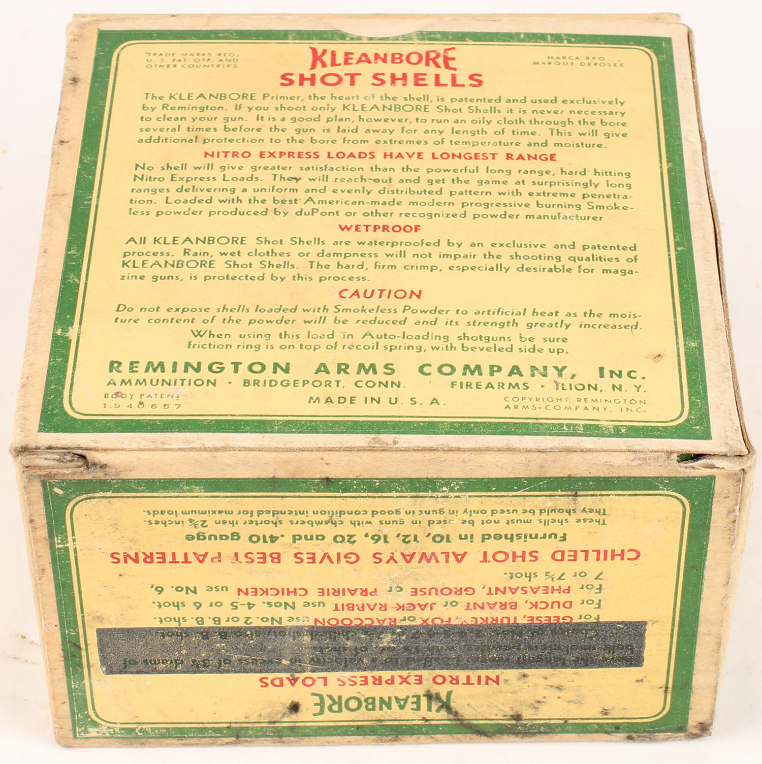 Remington Kleanbore, US PROPERTY, NITRO EXPRESS, 1pc., Full, shot size 00 BUCK Shot Loads, box is yellow, red and green, box is solid with soiling, shells are excellent. Grade: Very Good + - Value: 10 to 60