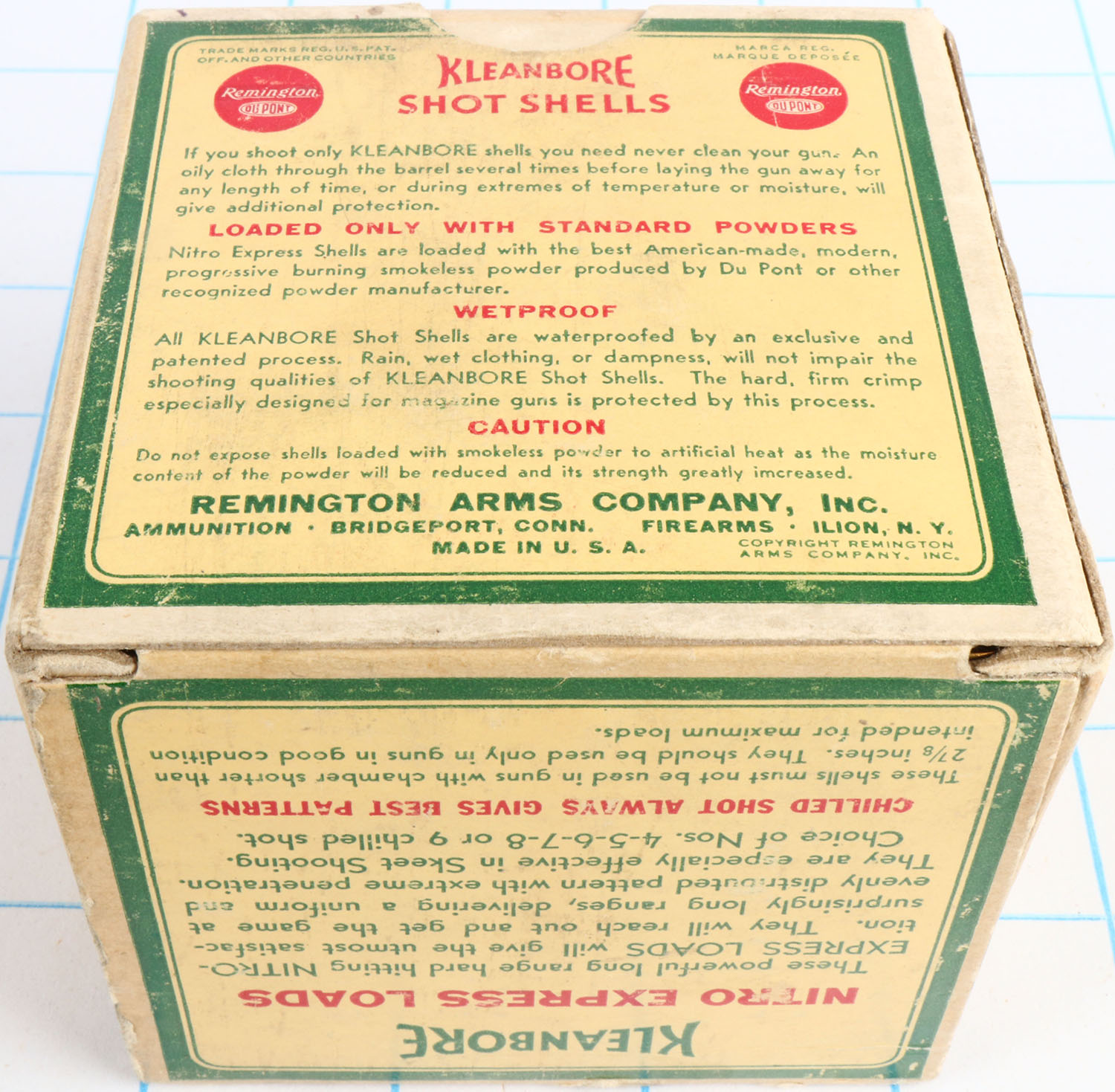 Remington Kleanbore, NITRO EXPRESS, 410ga., 3'', 1pc., Empty, shot size 9 CH, box is yellow, red and green, box has light scuffing & light soiling with very nice colors. Grade: Excellent - Value: 10 to 50