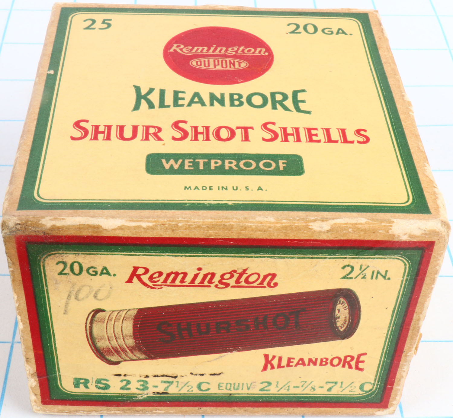 Remington Kleanbore, SHUR SHOT SHELLS, 20ga., 2 1/2'', 1pc., Full, shot size 7 1/2 C, box is yellow, red and green, box has light edge wear & light soiling with great colors, Shells are excellent. Grade: Excellent - Value: 10 to 50