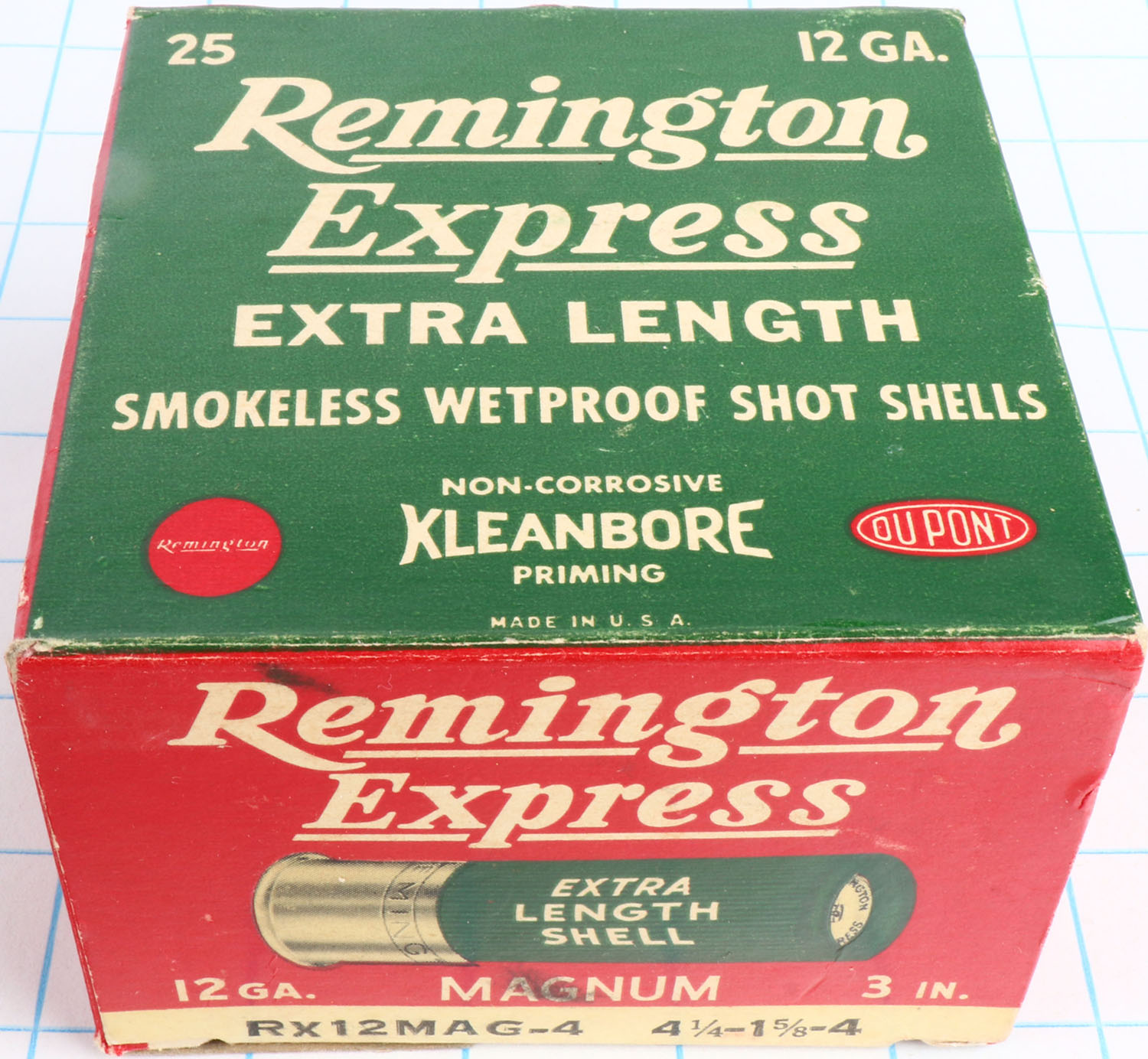 Remington, Express Extra Length, 12ga., 1pc., Full with 24rds being correct shot size, shot size 4 Magnum, red and green box, 3'', box is very solid with great colors, shells are excellent. Grade: Excellent ++ - Value: 10 to 50