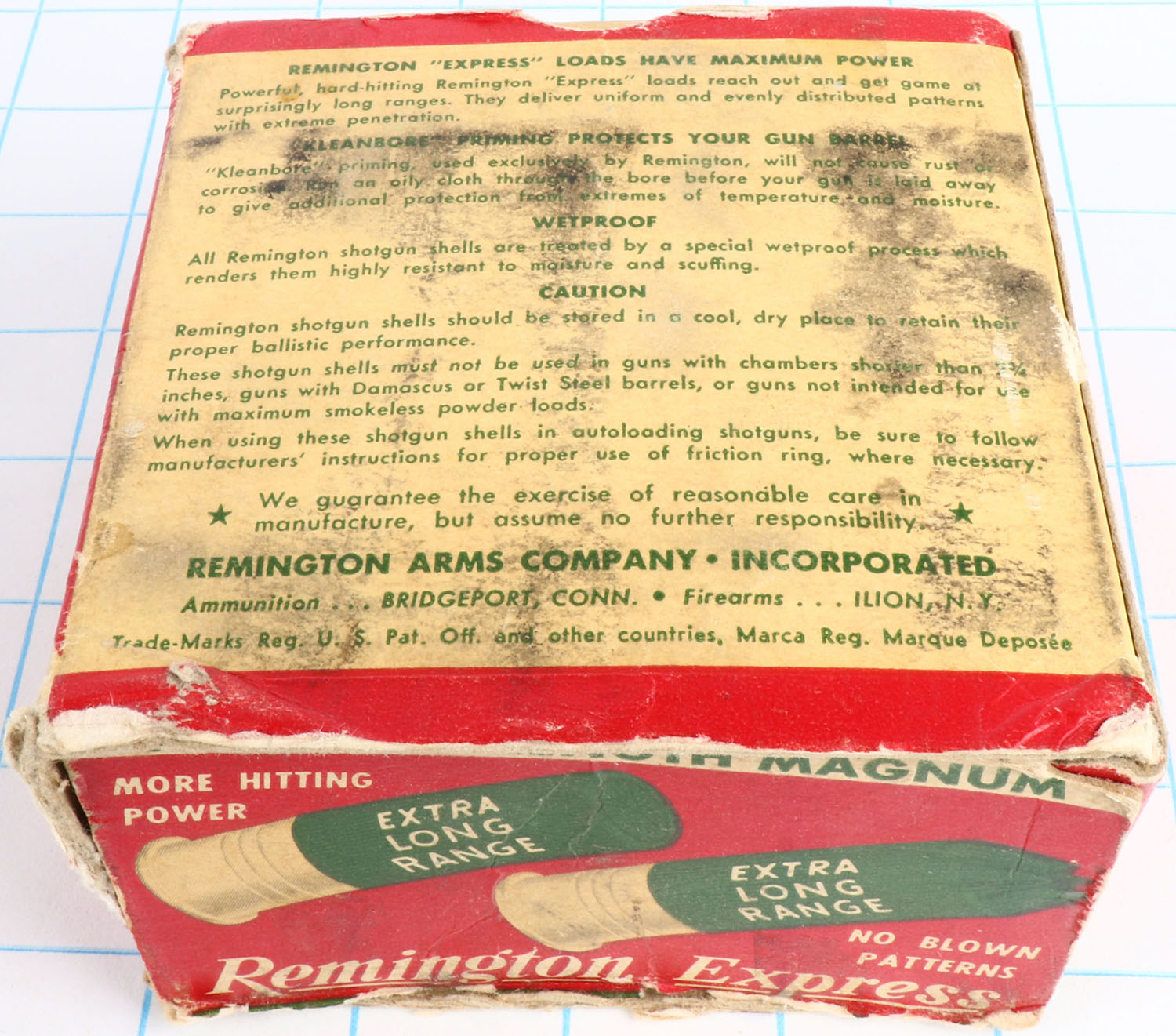 Remington Express, Standard Length Magnum, 12ga., 2 3/4'', 1pc., Empty, shot size 4, box is red, white and green, box has edge wear, light soiling, top flap is disconnected & top inside flap is torn with very nice colors. Grade: Very Good ++ - Value: 10 to 40